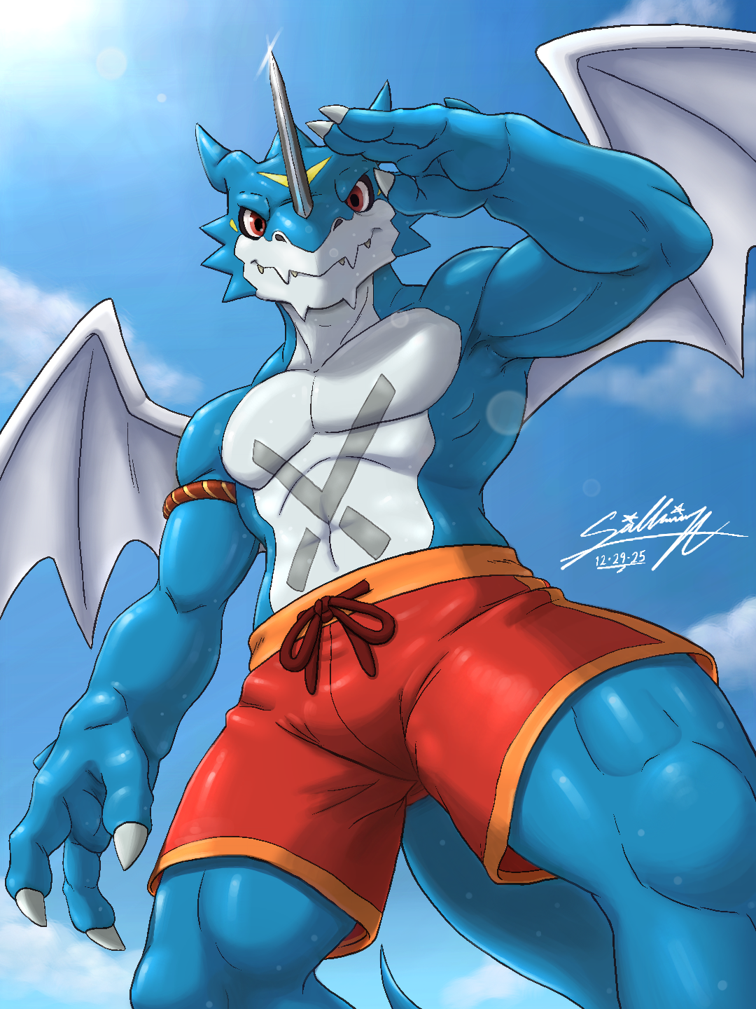 #digitalart #cartoon #fanart #anime #videogame #anthro #furry #scalie #handsome #blue #dragon #ExVeemon #Digimon #swim #trunks #shorts #flying #watching #muscle #armband #sky #clouds #sunshine #drawing