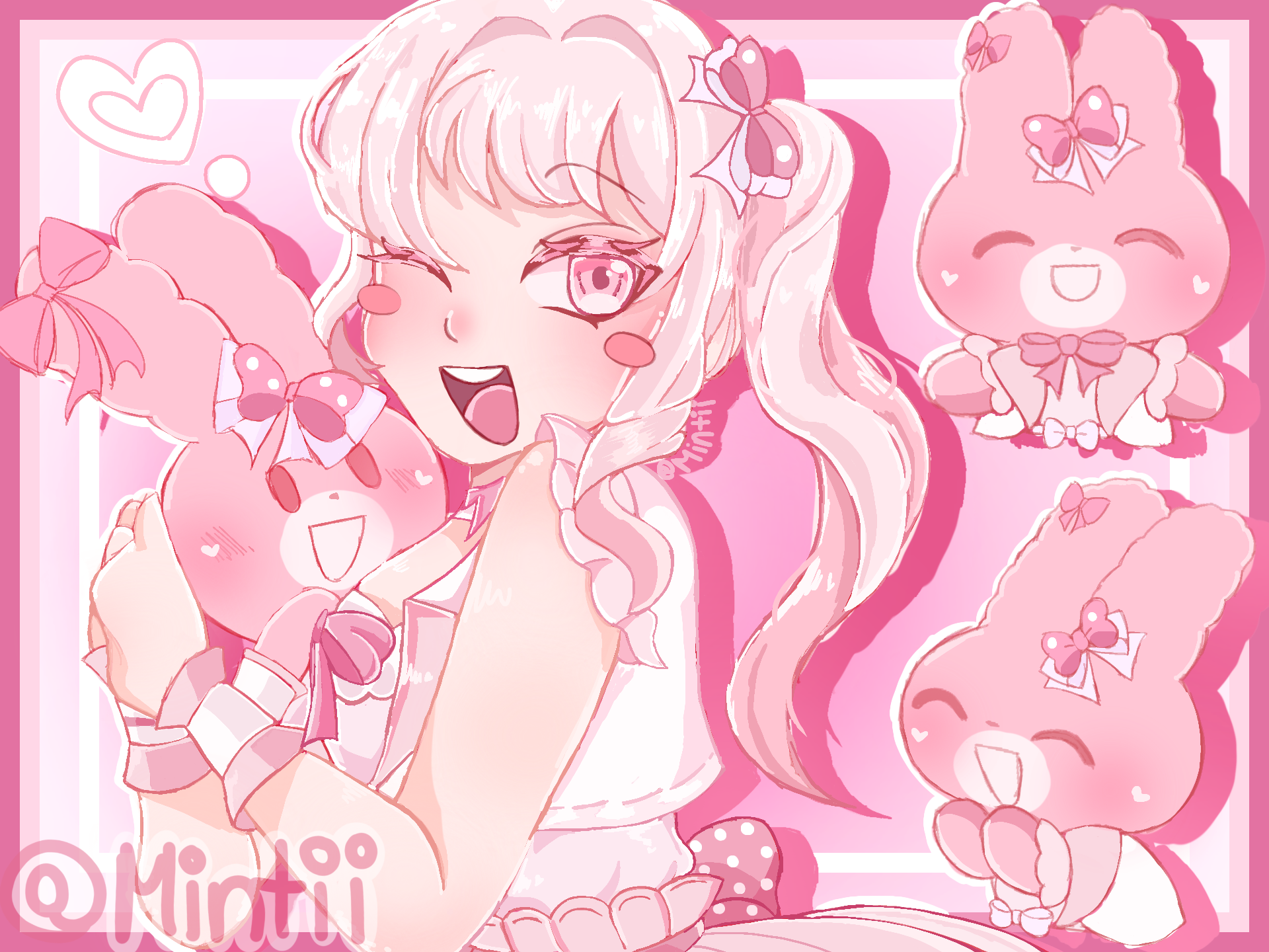 AWWW MINTIII SHES SO BEAUTIFUL AND BEYOND SUPER CAYOOOT SHES EVERYTHING I EVER WANTED TYTYTYTTYTYYY<333 I love all the pink color schemes in this and the chibi lil bunnies are too adorable waaa I cant stop looking at it , every detail feels like a lil hug