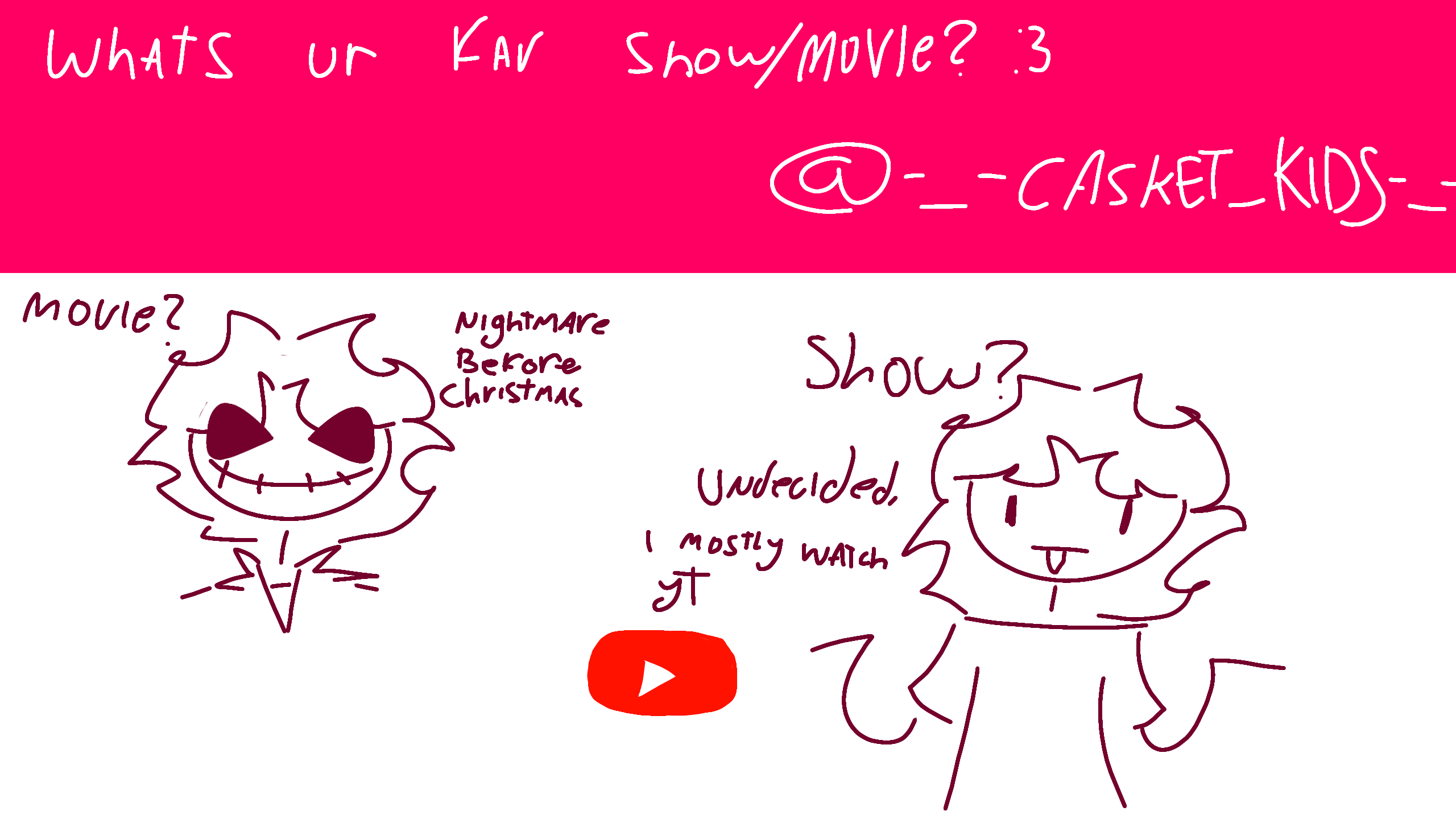 question: "whats ur favourite movie/show? :3"by: @-_-CASKET_KIDS-_-movie?: nightmare before Christmasshow?: undecided, i mostly watch youtubety for asking your question! ^_^