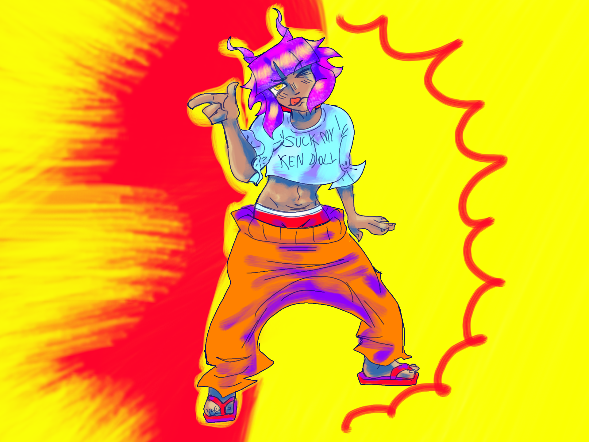 i mean, the princess sleeved shirt w text that makes no sense, giantly oversized neon orange sweatpants, and red flip flops, i am sad to say, do not pair well together, lol :sob: