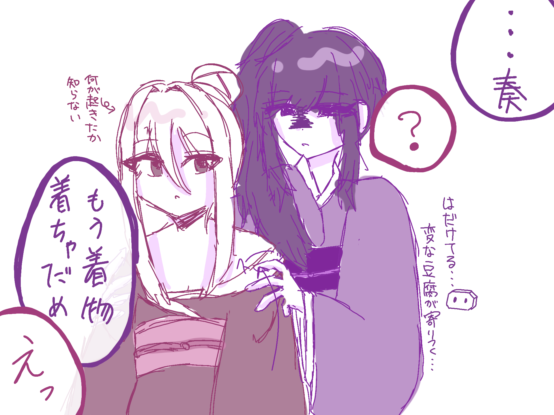 あけましておめでとうございます今年もよろしくお願いします!!最初の投稿がこれでごめんなさいでもなんか描きたくて…(変態)着物の描き方分かんないので適当です…ゆるして…。 #プロセカ #宵崎奏 #朝比奈まふゆ #セカイの日常
