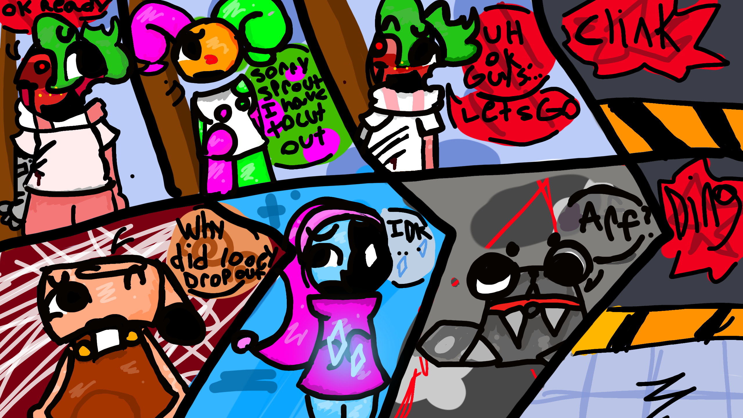 sprout, made a run to go find cosmo looey wasent happy bc of yatta so left, the run-