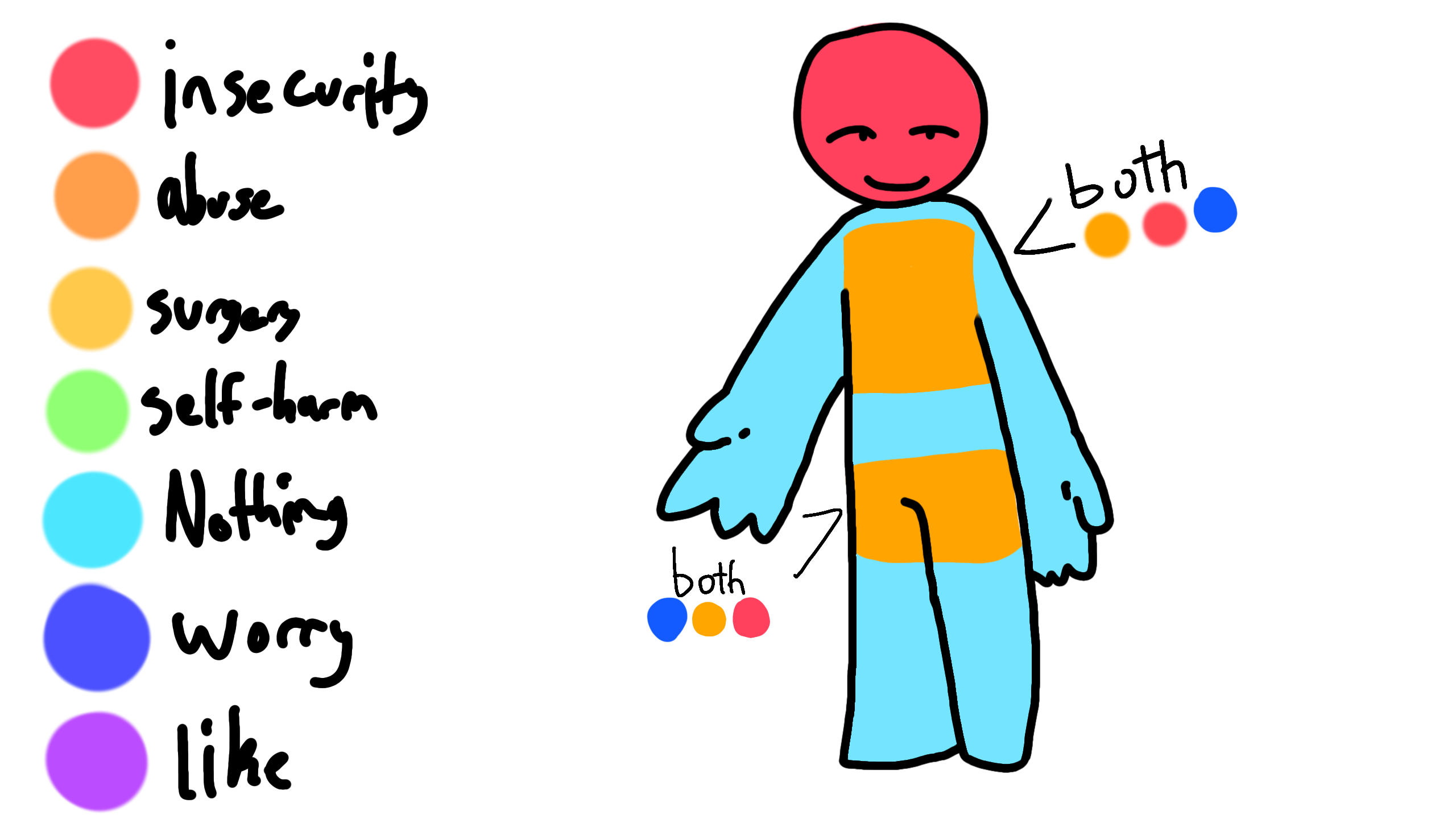 @Poppy-4-life okay so... this is me? And what I mean both is I have worry, I have been abused, and I am insecure. About those places- like the places marked orange-