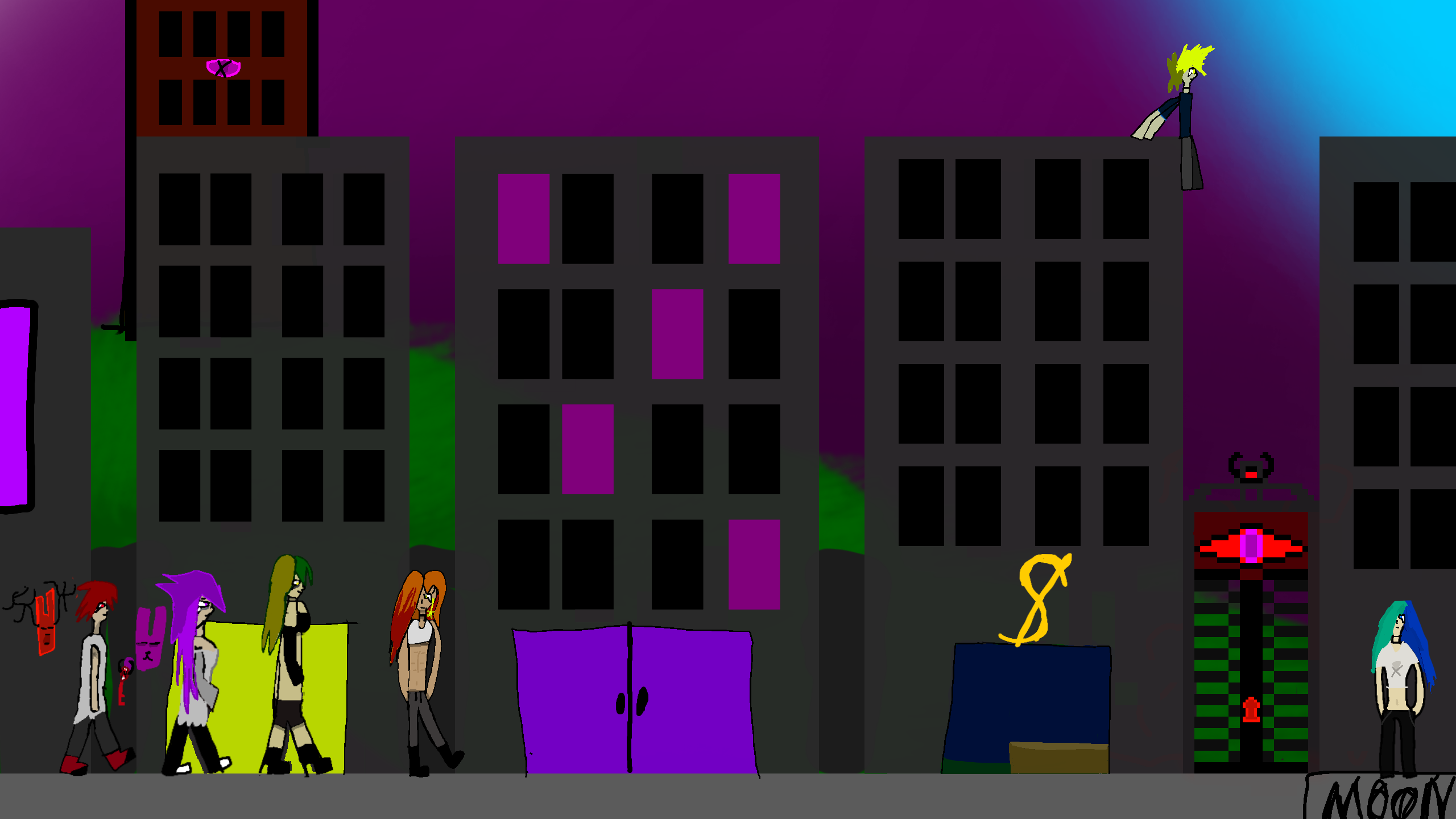 in this painting we have my oc my male oc glitcher rose minxx chief sun and mw
