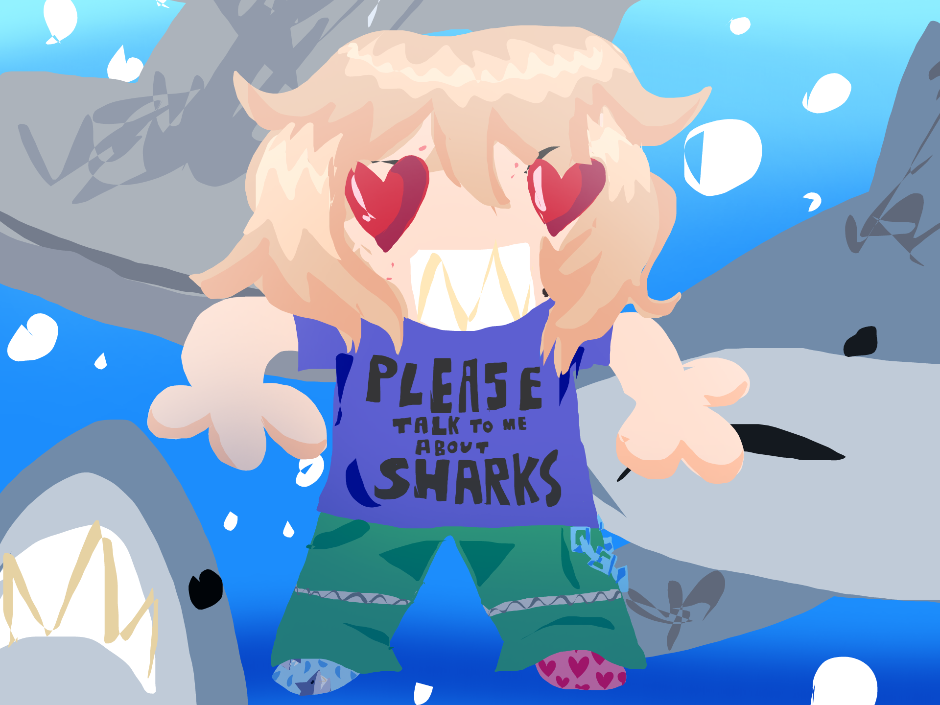 I love the select fill tool, it reminds me of drawing in paint for some reason. The background was fun, I looked up some shark references and yeah, sharks are cute.