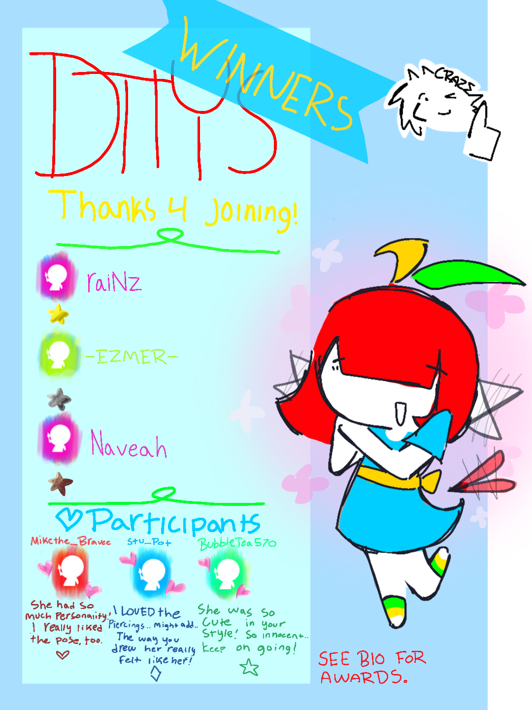 @-EZMER- in second, will receive either 2 headshots, or 1 full body drawing!!