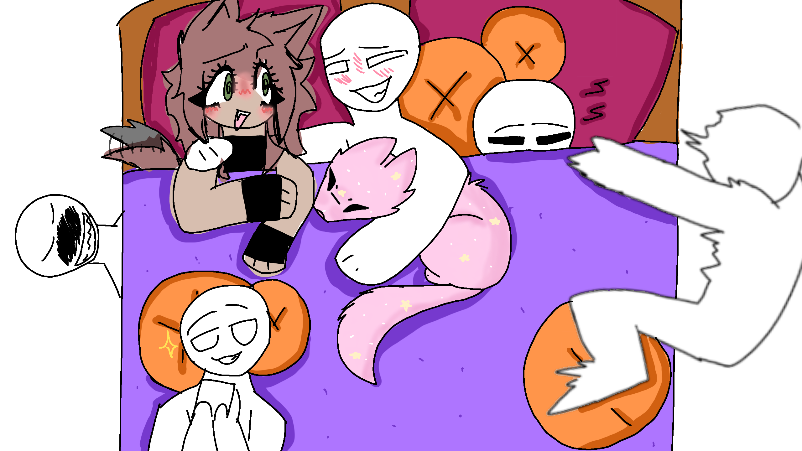 person 1: @-Boxy-person 2:person 3:person 4:person 5:person 6:dog/cat: @Squirrel0125 #Sleepover111 #base #Sleepover #bed #people #remix #remixable