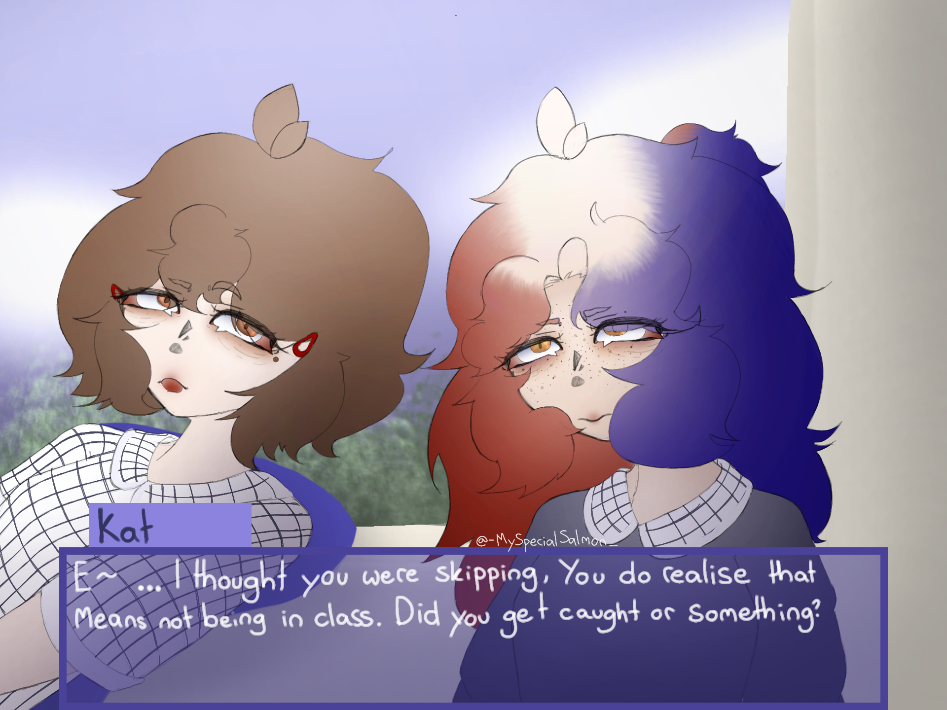 You go back to class after Yumi promised to not tell anyone. You had only been gone about 10 minutes which is reasonable as the bathroom is far away. So no one'll suspect anything... Or atleast everyone but Kat. She knows you never go to the bathroom during class