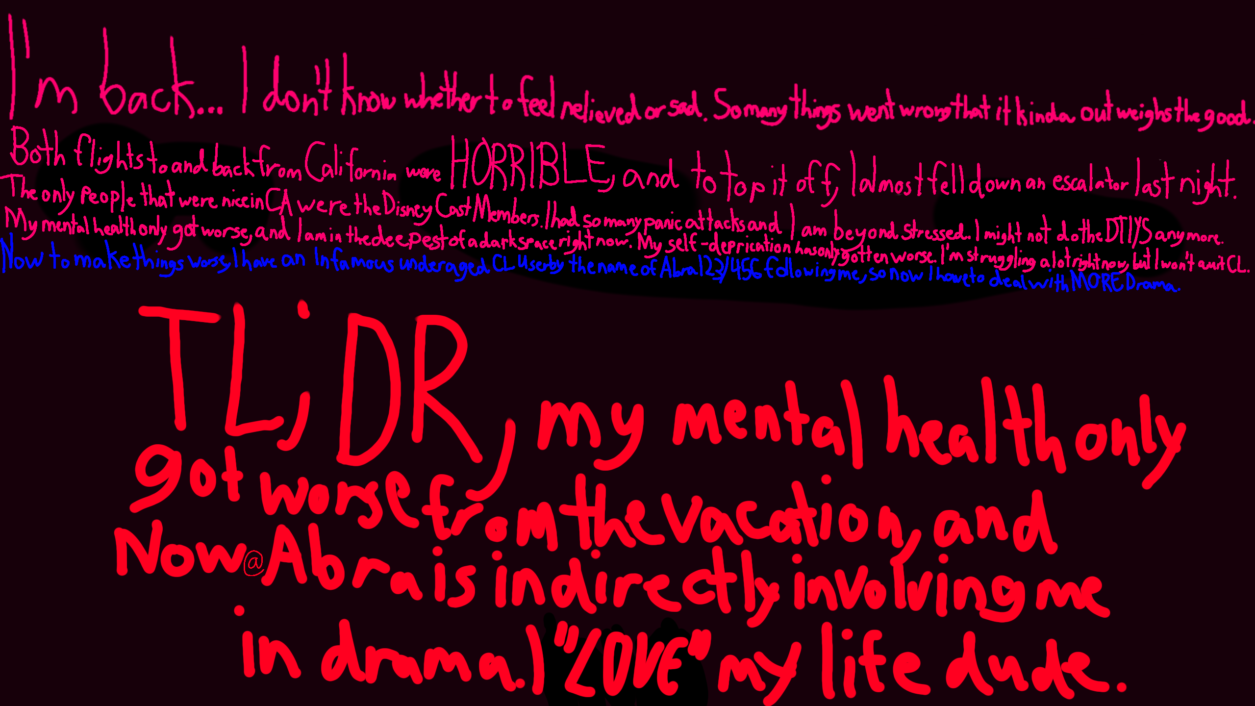 additional TL;DR, I might cancel the DTIYS for the sake of my mental health due to the vacation being more stressful than relaxing, and also because of Abra.