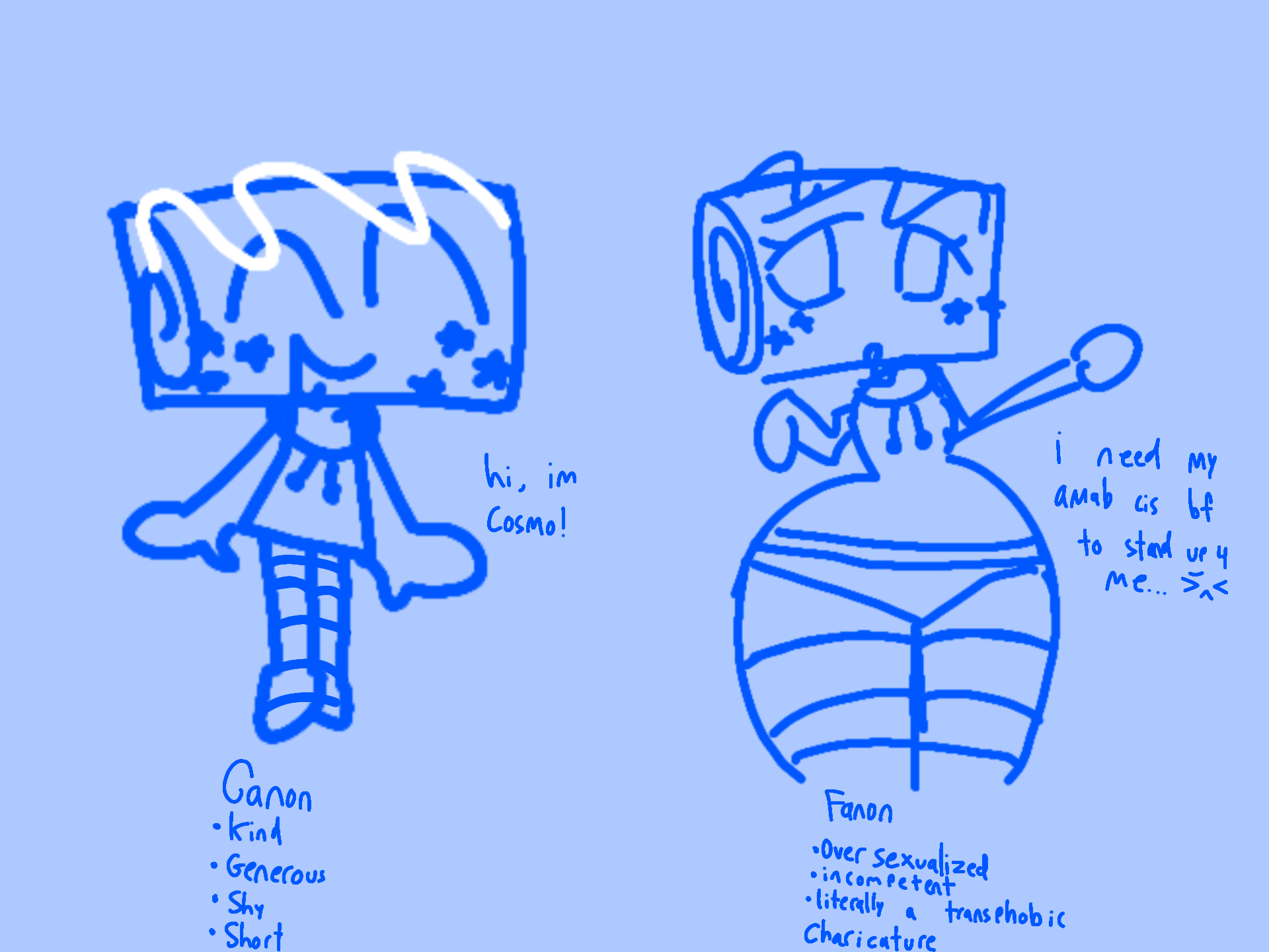 making the character u hc as a trans man seem like a joke, fètish or just an 'uwu bottom omega twink who needs his cis bf to protecc him!!!!': :thumbsdown: