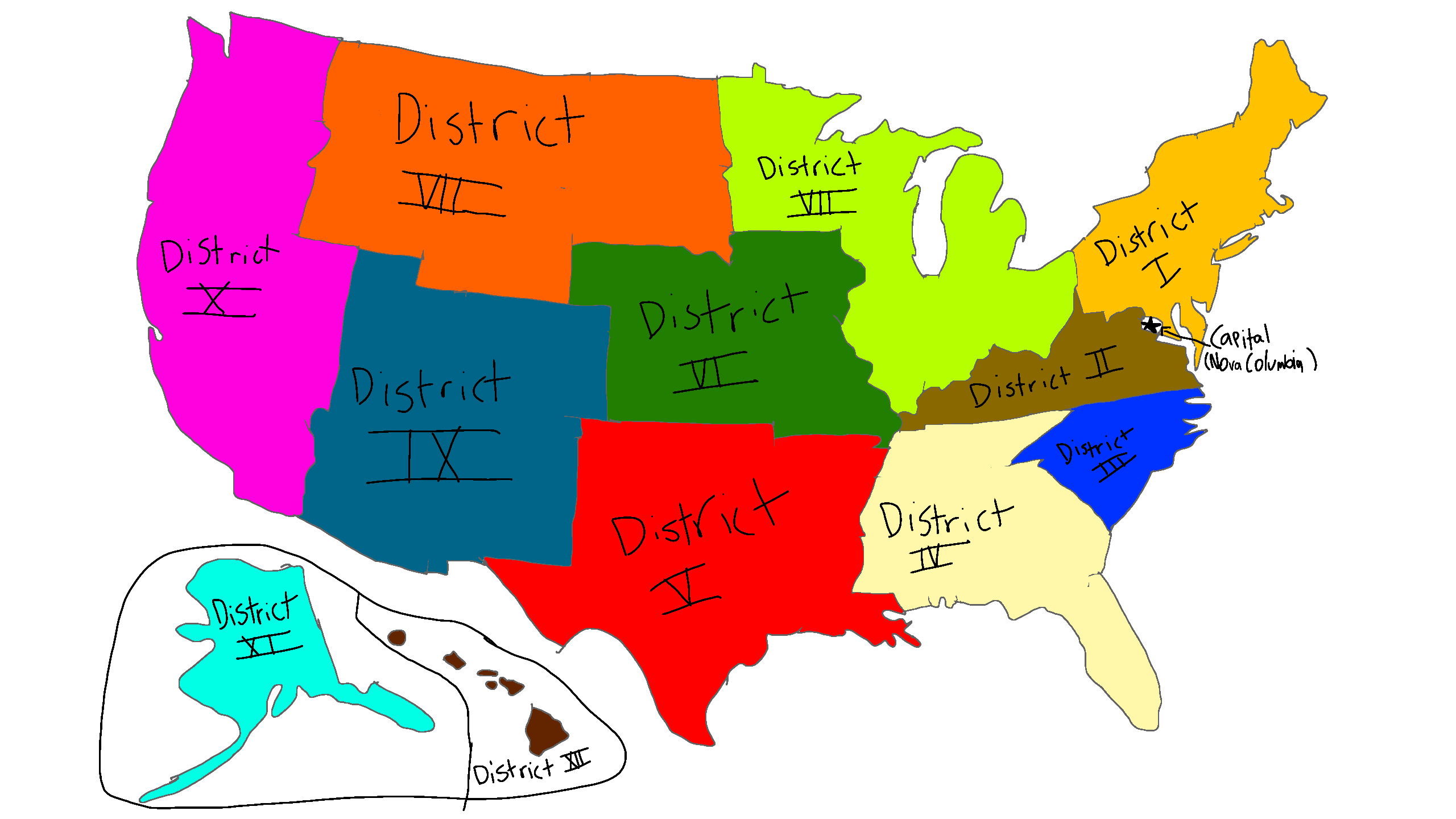 There are 12 "states" known as districts, and the capital known as Nova Columbia. it has a semi-totalitarianist government. and has a total population of 27,625,082 (as of 2063).