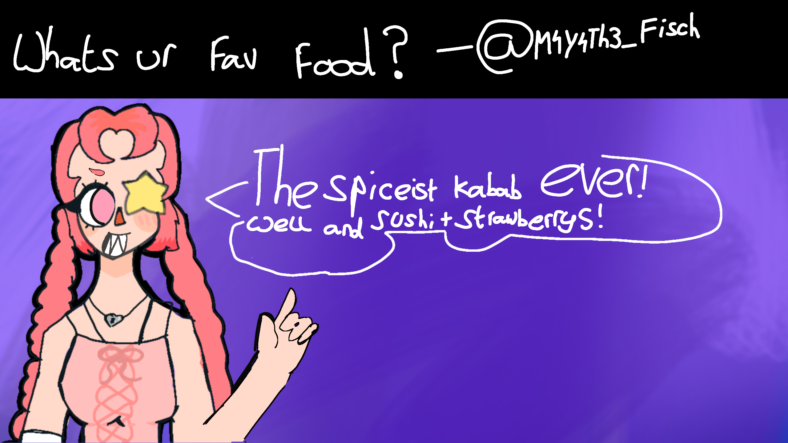 Q @M4y4Th3_Fisch asked "Whats your fav food?"A"THE SPICEIST KABAB EVER AND SUSHI AND STRAWBERRYS"Ty for the question! #Qna#oc