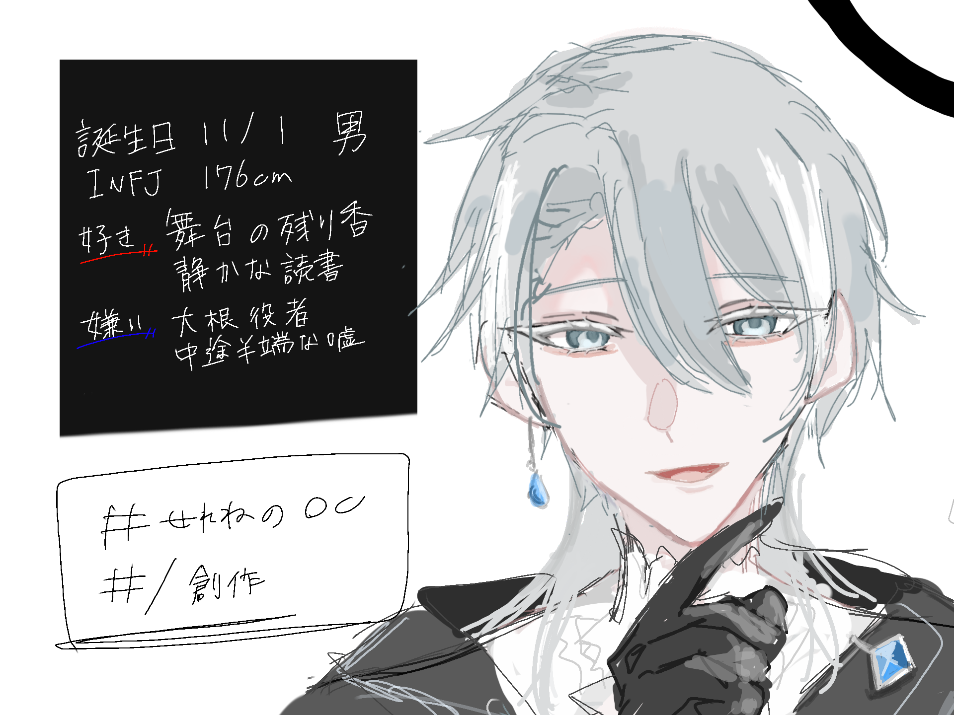 #せれねの創作自分のキャラの顔同じ過ぎて やば汗----------------------[設定]かつて王都の劇場で「数年に一度の天才」と謳われた若き主演俳優。最高の舞台を夢見、その稽古の最中に静かに息を引き取った幽霊の俳優。表情こそ乏しいが、その瞳は常に「他者の輝き」を熱心に、そして謙虚に観察している。
