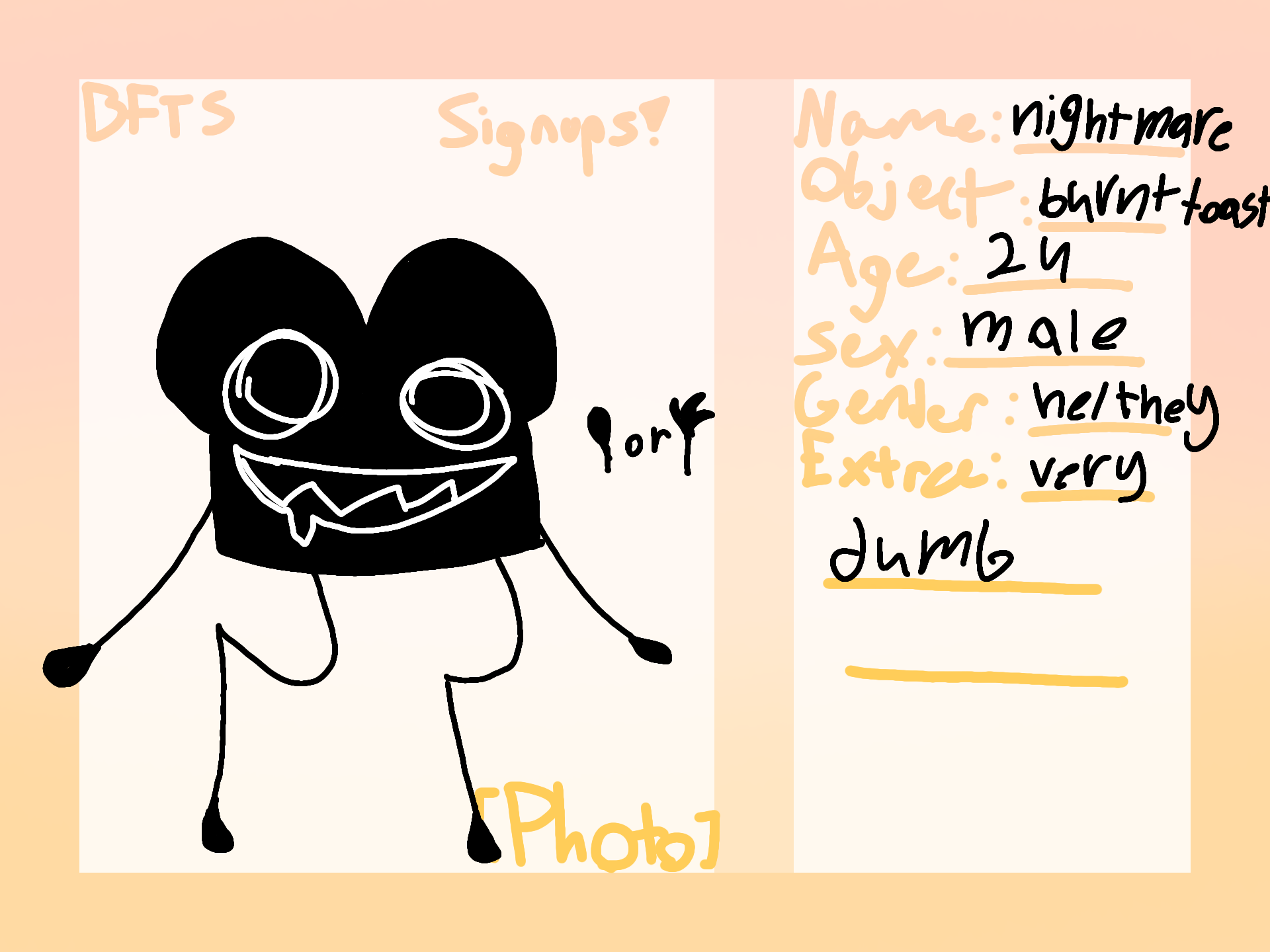 Extra(optional): hes very dumb and others are usually afraid of him due to his creepy appearance