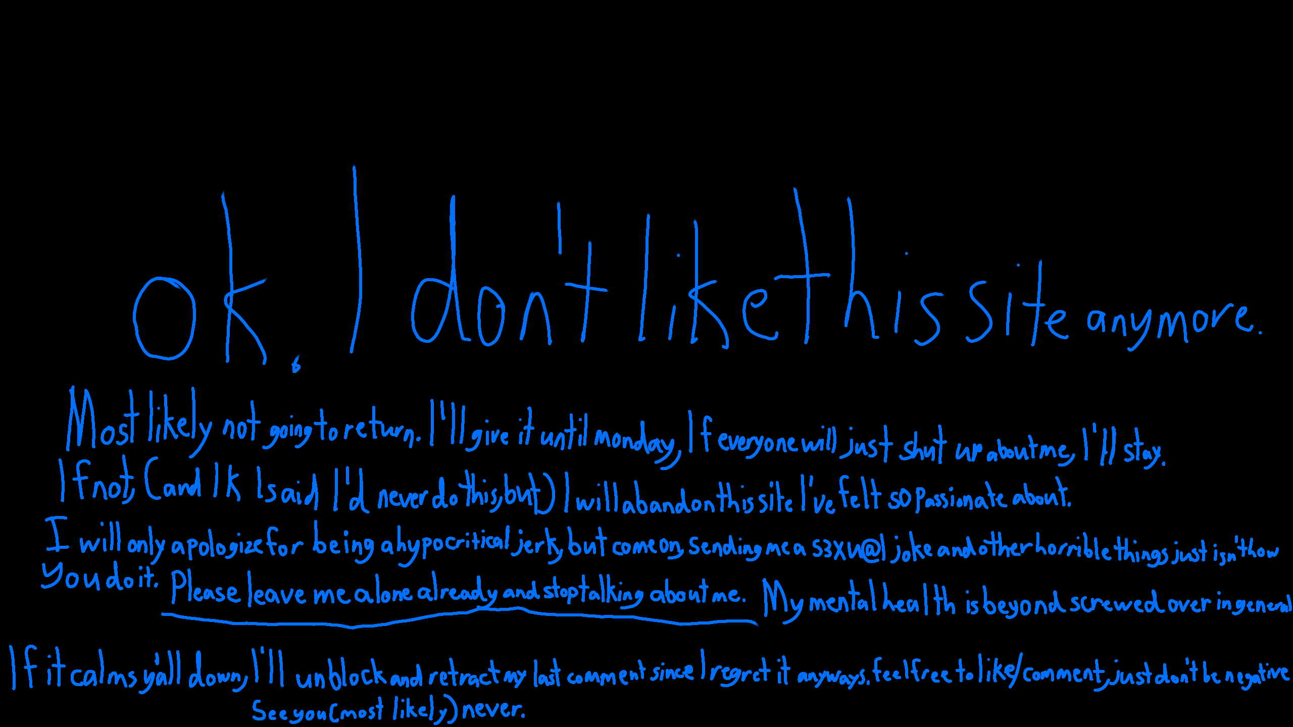 but please understand that everyone involved that is saying things about me that arent true has really demotivated me from ever wanting to touch this site