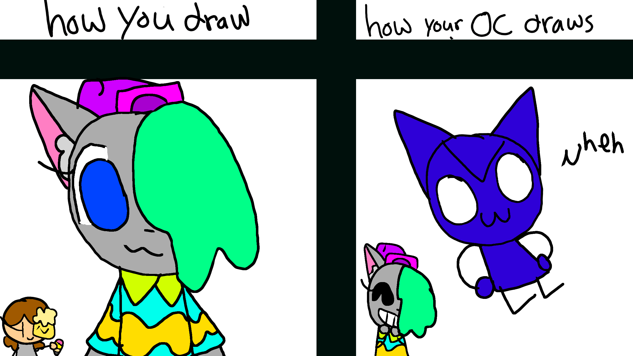 i go more cartoony and yoghourt goes more chiby and draws a character she calls brave cat man @footten