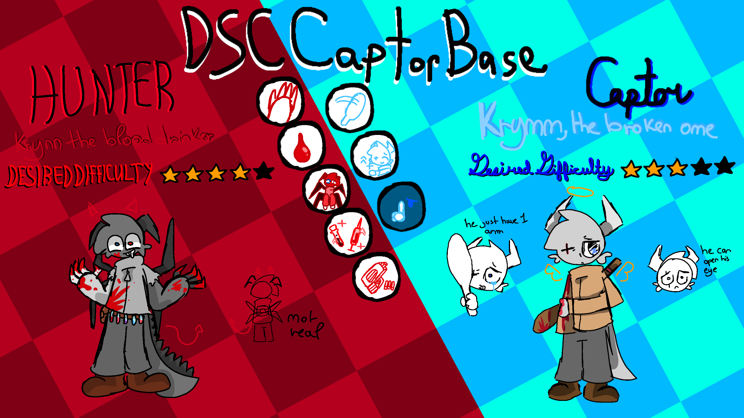 Regarding his passive abilities (we're still talking about the Captor) I thought kt would be funny if he could regenerate his HP, but not very quickly, like just 10 HP every 10 sec(if 10 HP is really not much, bcz I don't want to make him an overpowered character) He can also sacrifice HP (there be thresholds) to lower his cooldowns, but that would be a perm loss of HP (imagine he has 100 HP and decide to sacrifice 10 HP to lower the cooldown by 10 sec, he will never be able to heal those 10 HP)