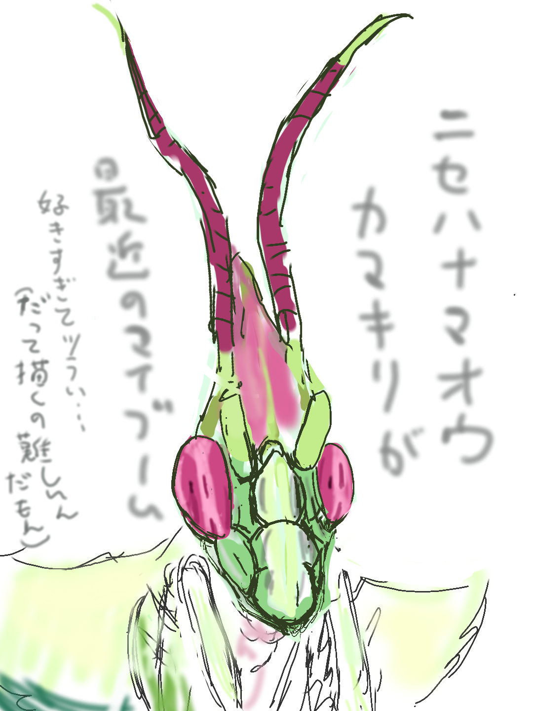 何か虫を描いてみたくなったので、そこからハナカマキリに飛んだのかと・・・あ、また文章書いてて思い出したが、ハナカマキリの前に何でだったか忘れたがハナカマキリがモチーフの【虫ポケモン】の画像を見て興味が湧いたからかも。(・・・あれ?その前にウデムシ調べてた時にカラスバさんの手持ちポケモンが上がってきたからだった記憶が・・・)