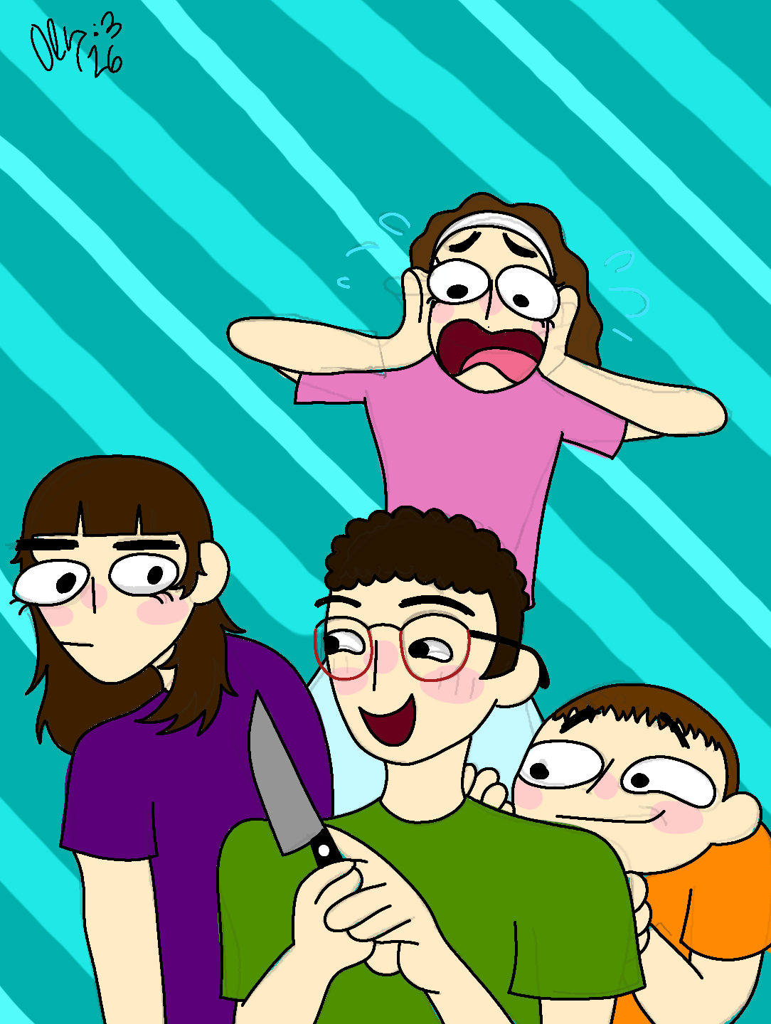 Im the one in purple, my bestie Victoria is wering pink, Yago is holding a knife and Marco is sneaking in the corner I luv them so much <333