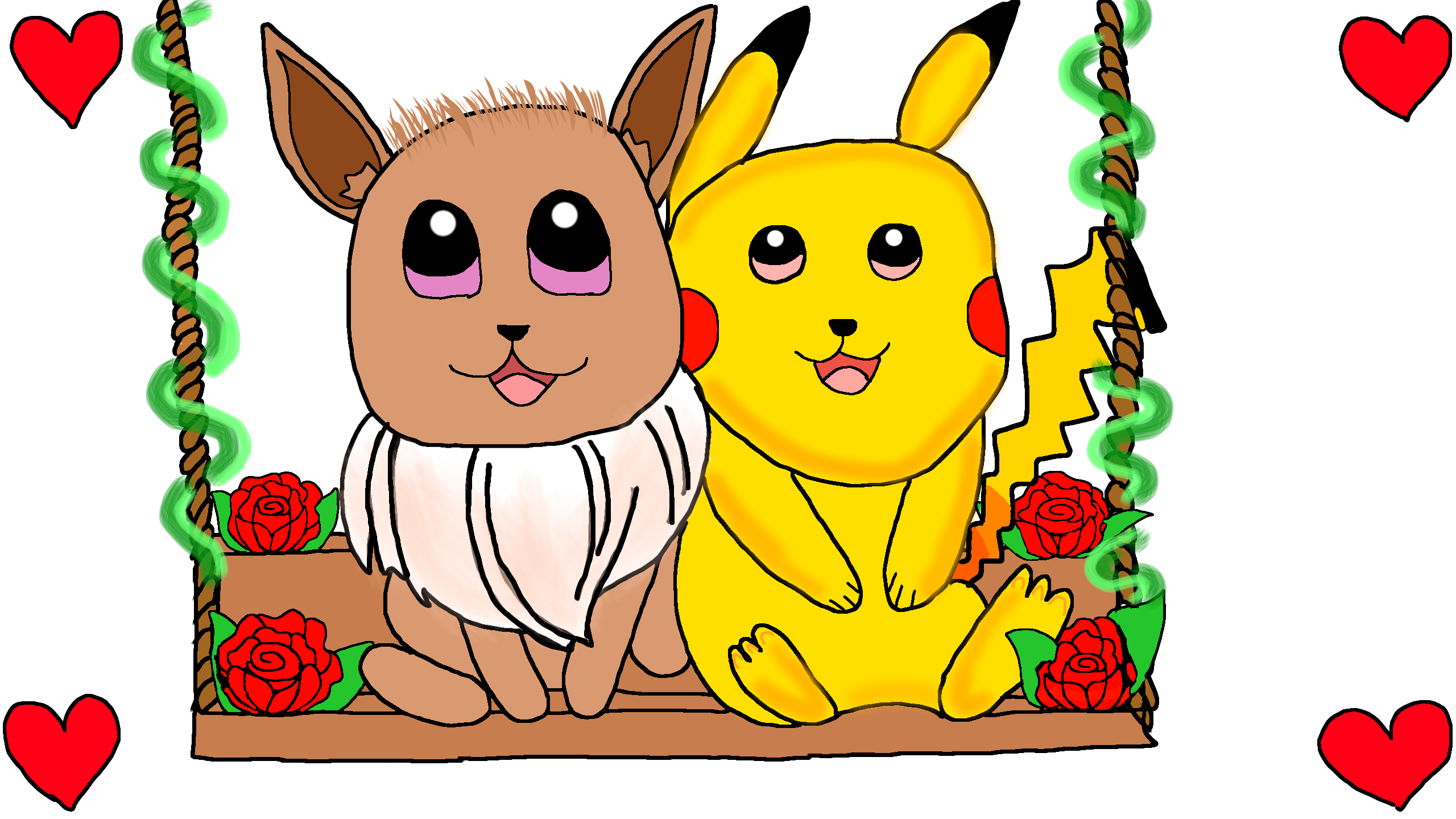 *A wild Sylveon appears out of nowhere, jumps happily on the swing and hugs Pikachu and Eevee with its feelers. But due to Sylveons impact, everyone falls from the swing and crashes to the ground. At first, Sylveon starts laughing while the others are confused, but then the Pikachu and Eevee start laughing too.*