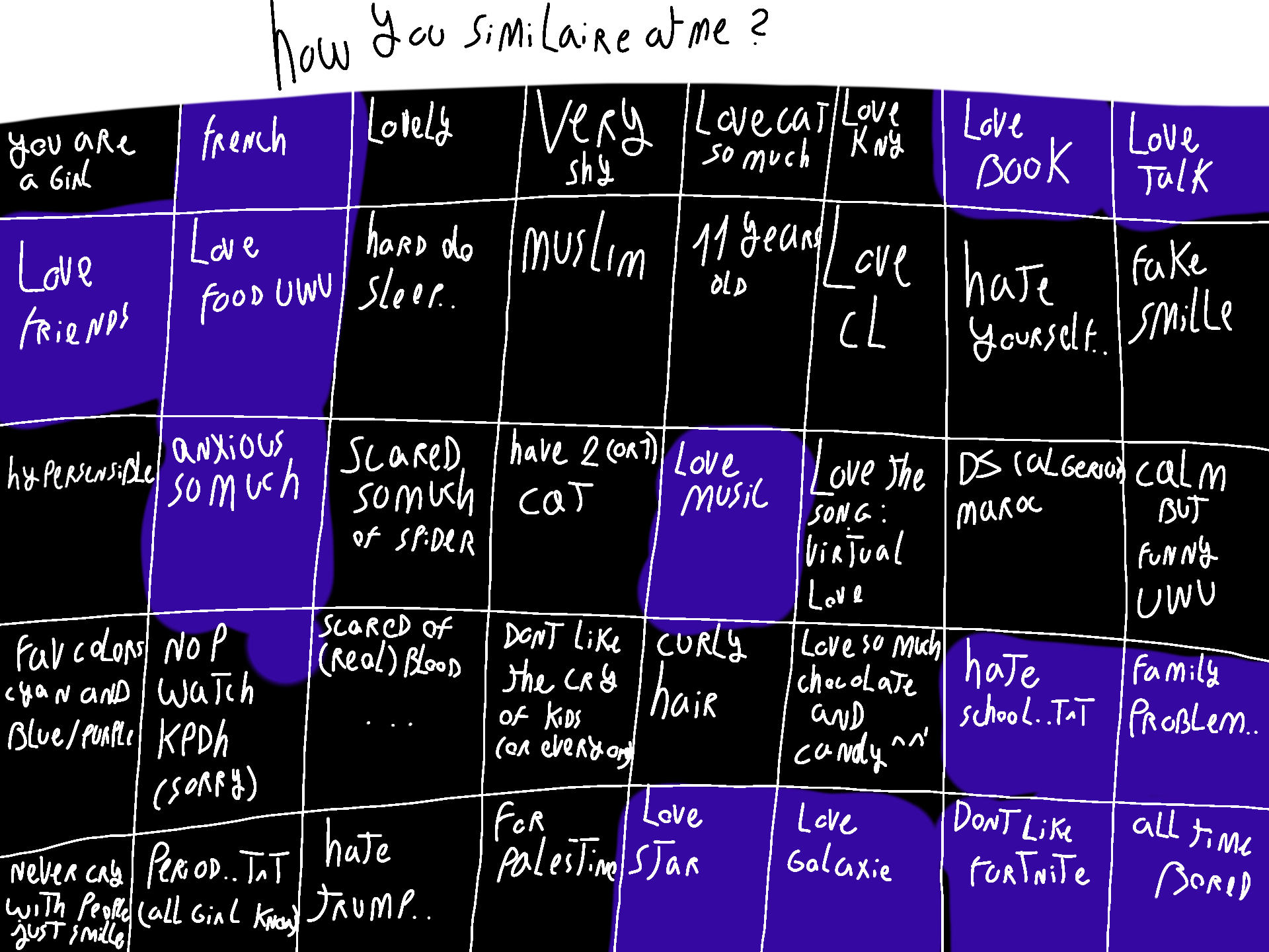 How are u similair at me ? ;-;