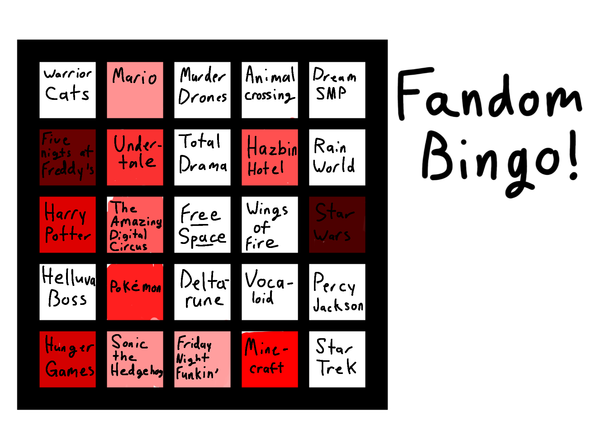 darker=bigger fandom lighter=less fanomPls credit me if you do use!!Edit: Feel free to list additional fandoms on the side :D