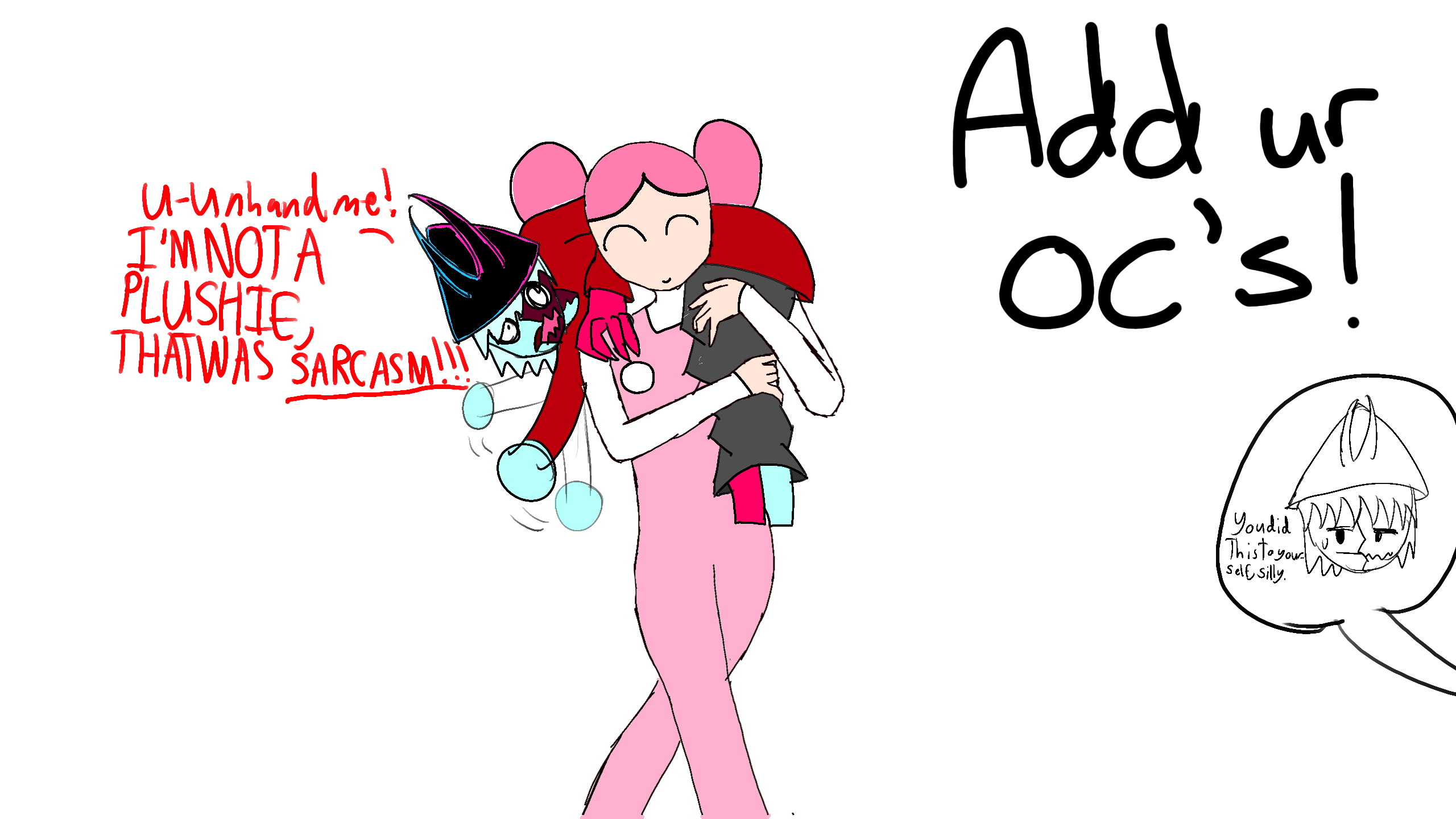 Silly: "SHE'S KIDNAPPING ME, I DON'T PLAN ON DOING WHATEVER SHE'S GONNA FORCE ME TO DO, SHE'S UNDER THE IMPRESSION THAT I'M A PLUSHIE!"