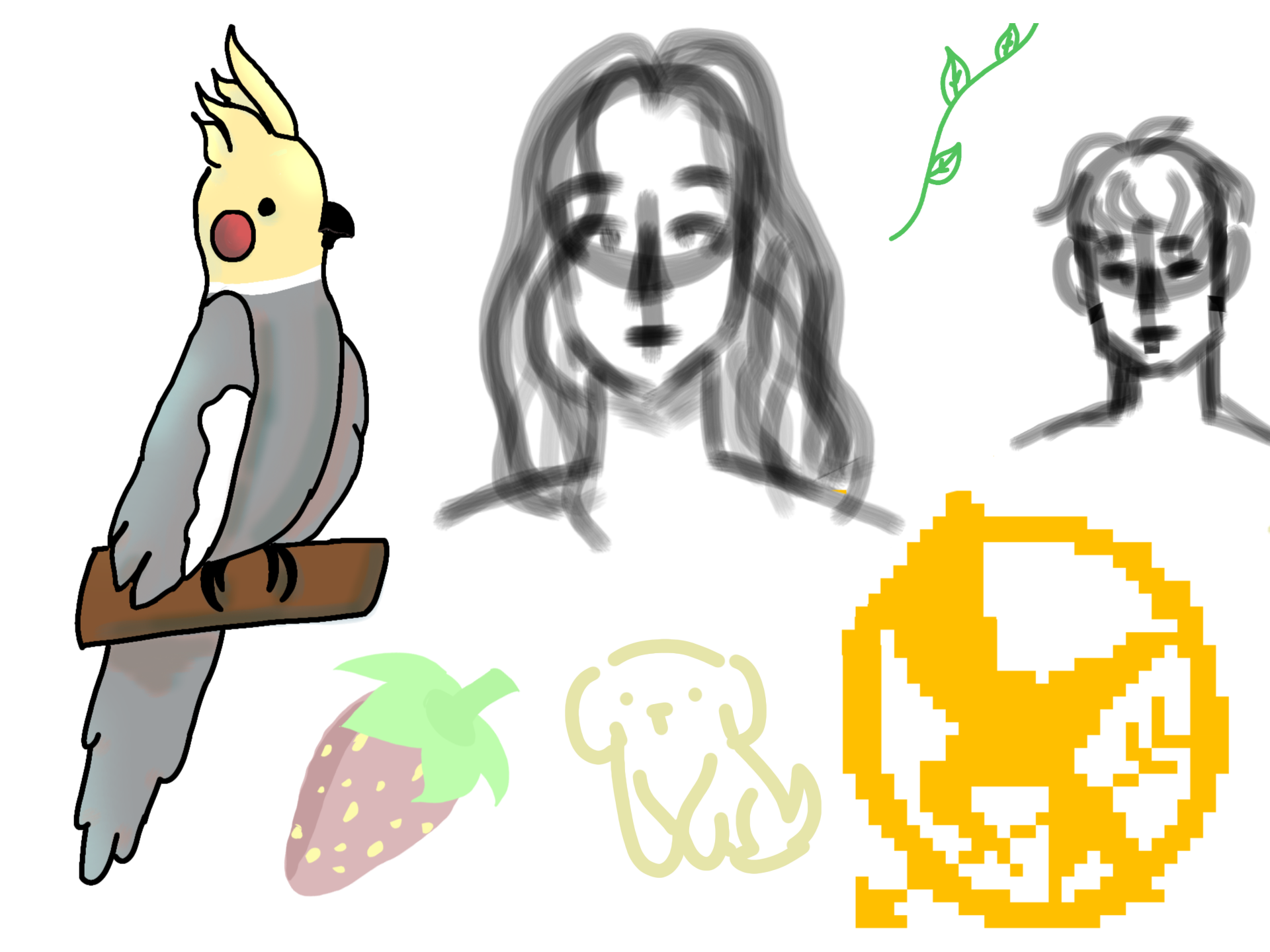 Some sketches :) I'll prob finish the girl later. parrot from my sketchbook! :D #messy #sketches #portraits #parrot #hungergames #strawberry #messingaround #cute #puppy