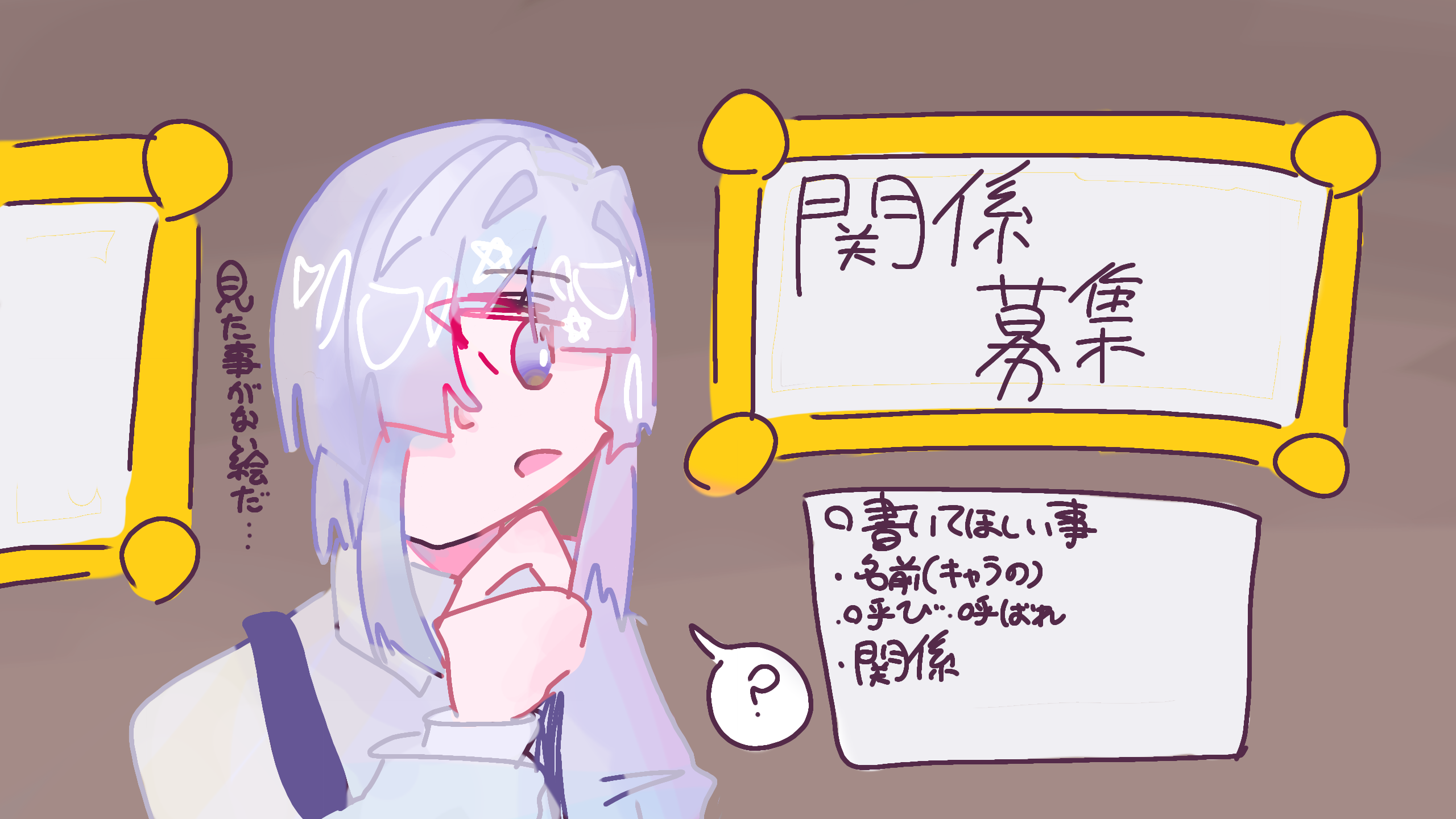 #記憶のゼロノ美術館関係募集です!!!書いてほしい事貴方のキャラの名前呼び、呼ばれどのような関係がいいかその他諸々あれば!誰でもokです!!!!ぜひ!!額縁雑すぎる追記 銀星2ありがとうございます!!!!!