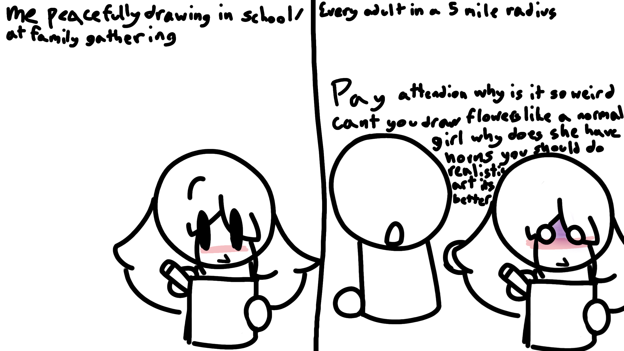 "Why can't you draw flowers and rainbows like normal girls?" Bc I hate doing color and prefer shading.