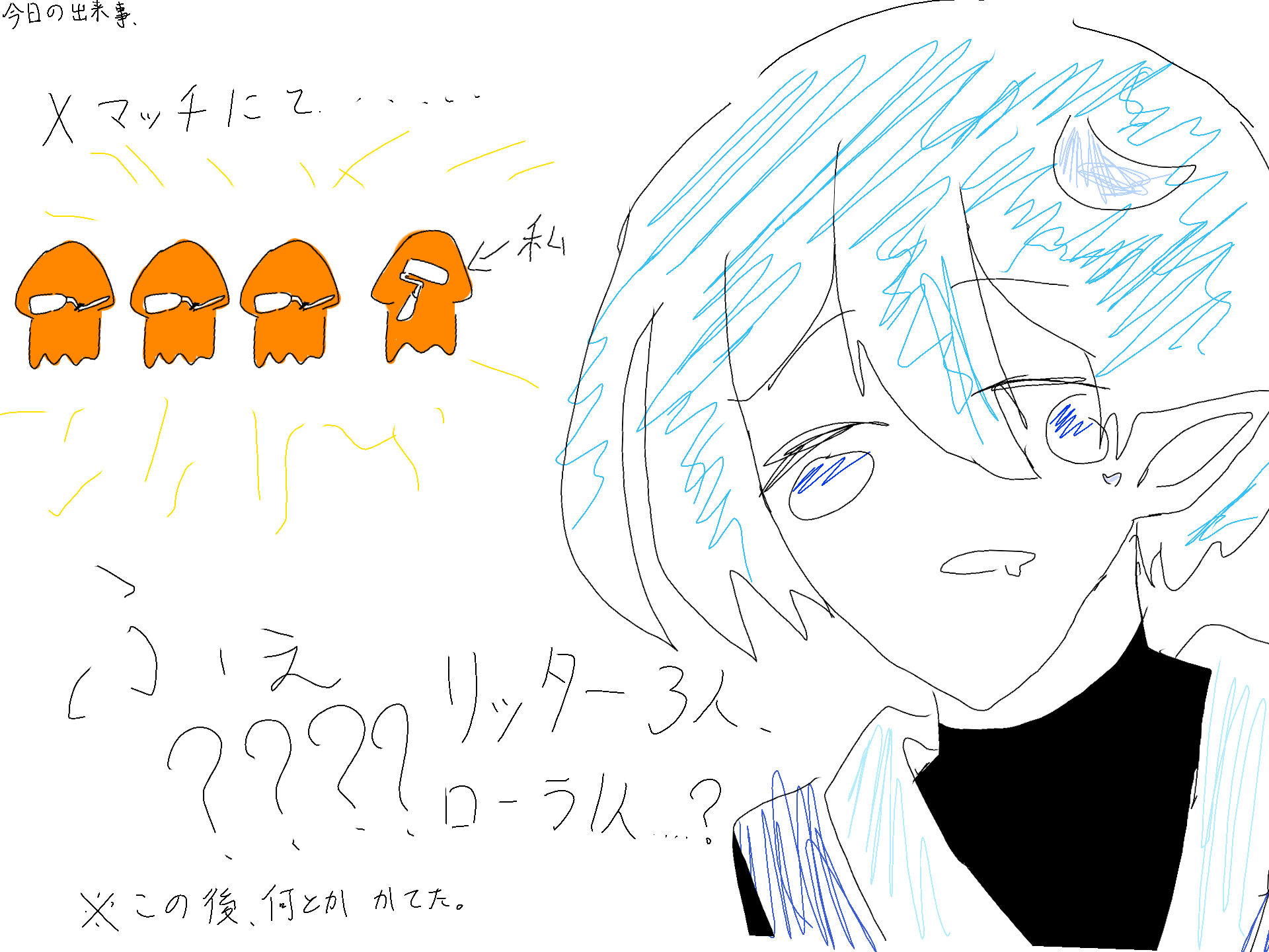 Xマッチのとき、普段リッターを使ってるけど、気分転換でローラーを使ったんですよ、そしたらまさかのリッター3人ローラー1人っていう地獄の武器編成だったていう、しょ~もない話でした。まぁ勝てたからいいけど(色塗りは雑です!) #ミラどらの代理追記 こんな雑な絵に銀星ありがとうございます!