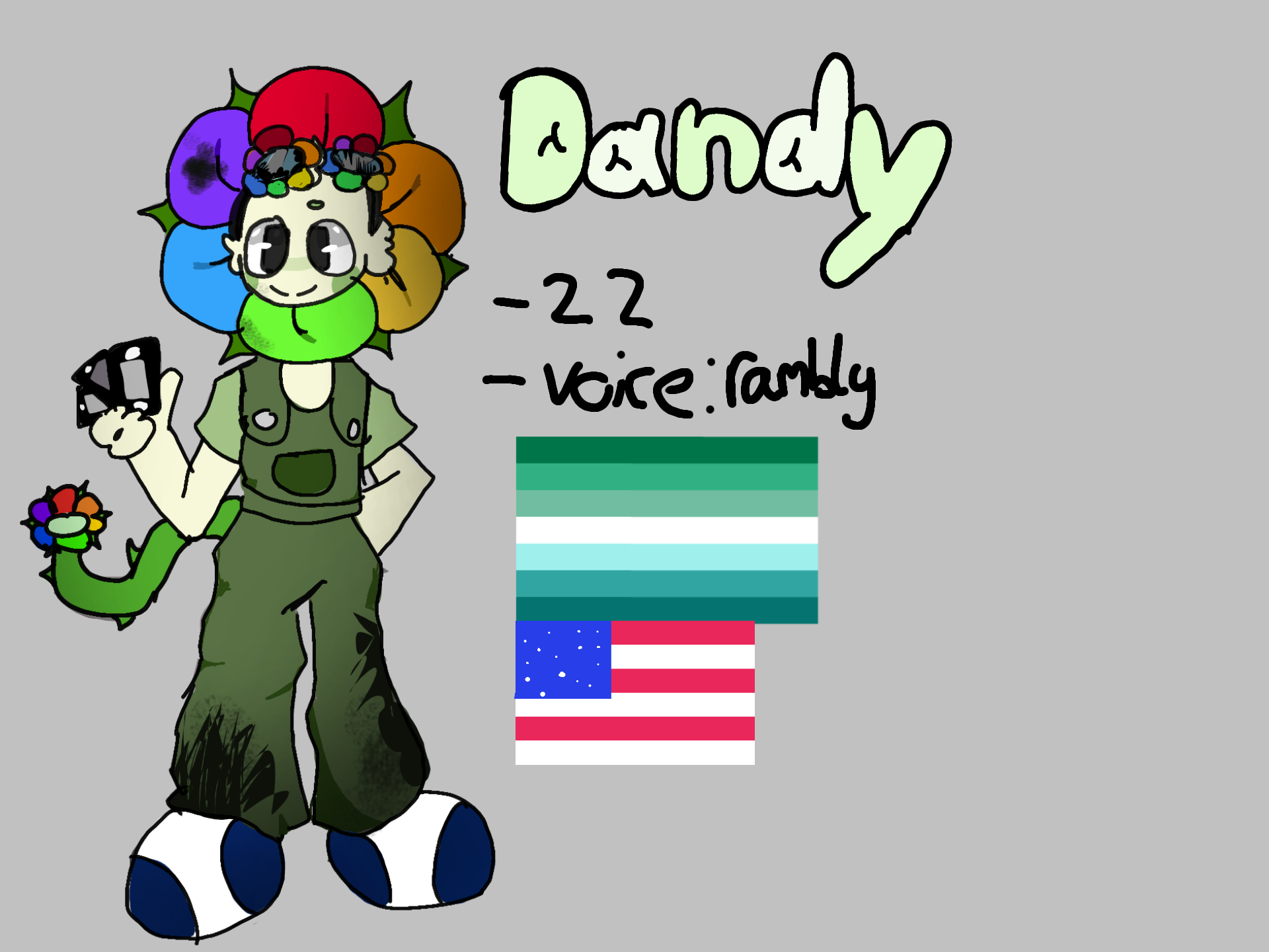 hcs:22,gay,american,fear of beind forget,morally grey(upset with his past ichor dessisons),i hc and see dandy as an inhaler user bc we do hear talk abt his breathing and befor u say it seid delilah fixed it id kinda feel like he would lie.bf:astro bsf:pebble