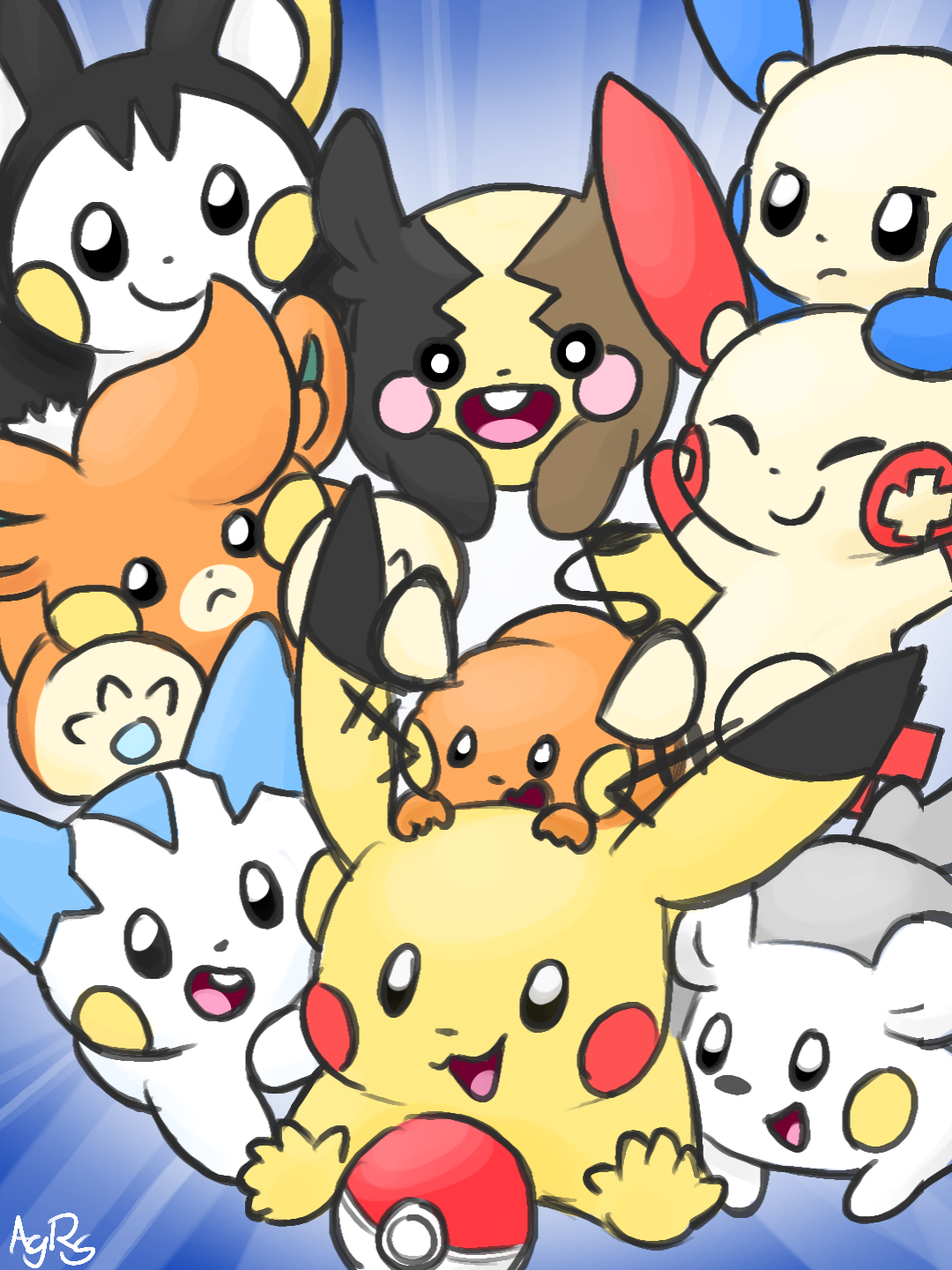 All the Pika clones together (minus the Raichus and their megas, Pichu, Pawmo, and Pawmot because I did not want to draw 16 Pokémon)!