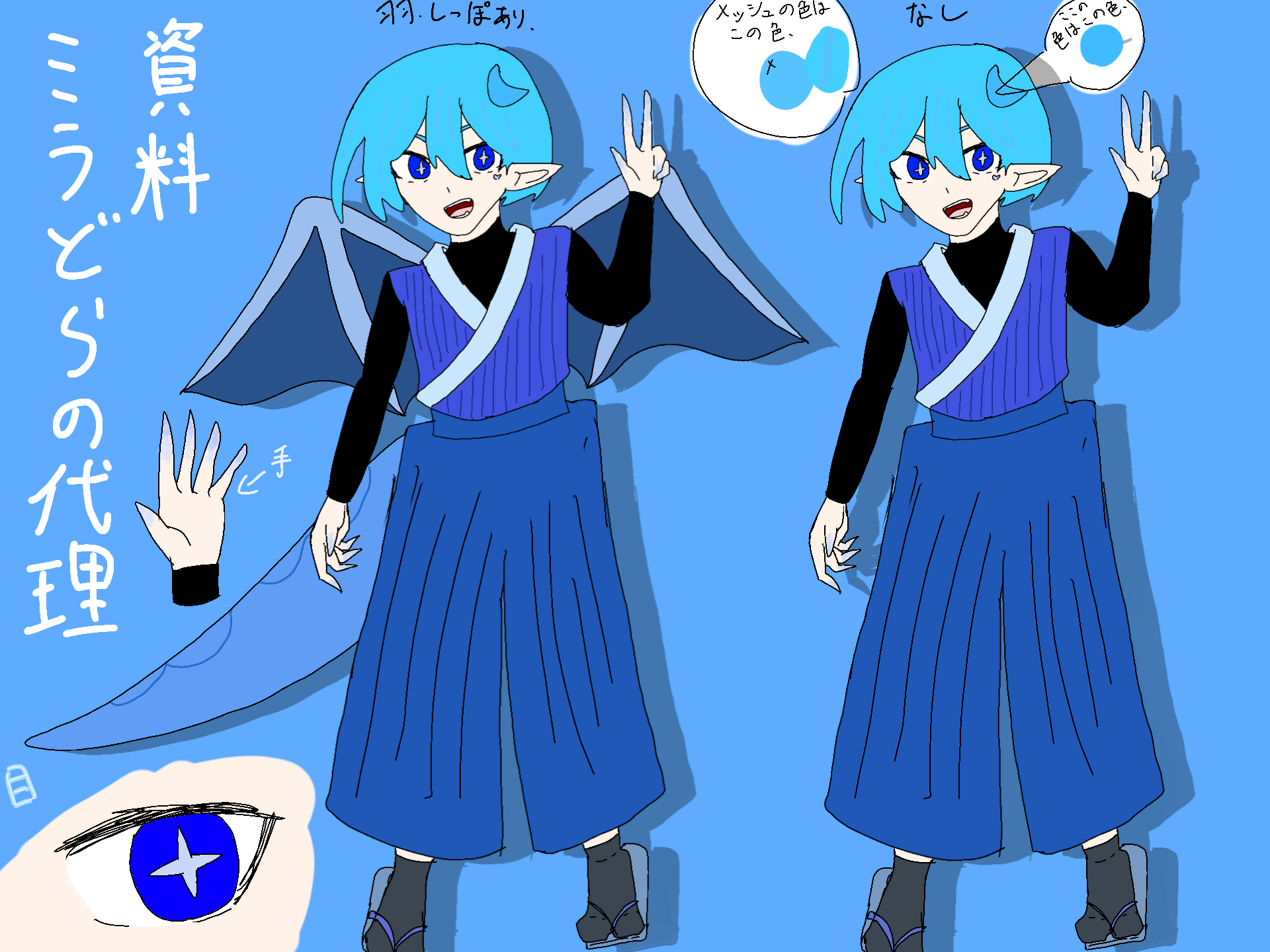 そういえば代理の資料をだしてなかったなぁ~と思い、出しました。こいつはバカとアホで、アイスが好きです。水色系統が好きです。羽と尻尾はどうにかして見えなくすることも可能それとゲーム好きすぎて、オールすることもあるとかないとか、、、、 #ミラどらの代理追記 ウワ!銀星アリガトウ!!