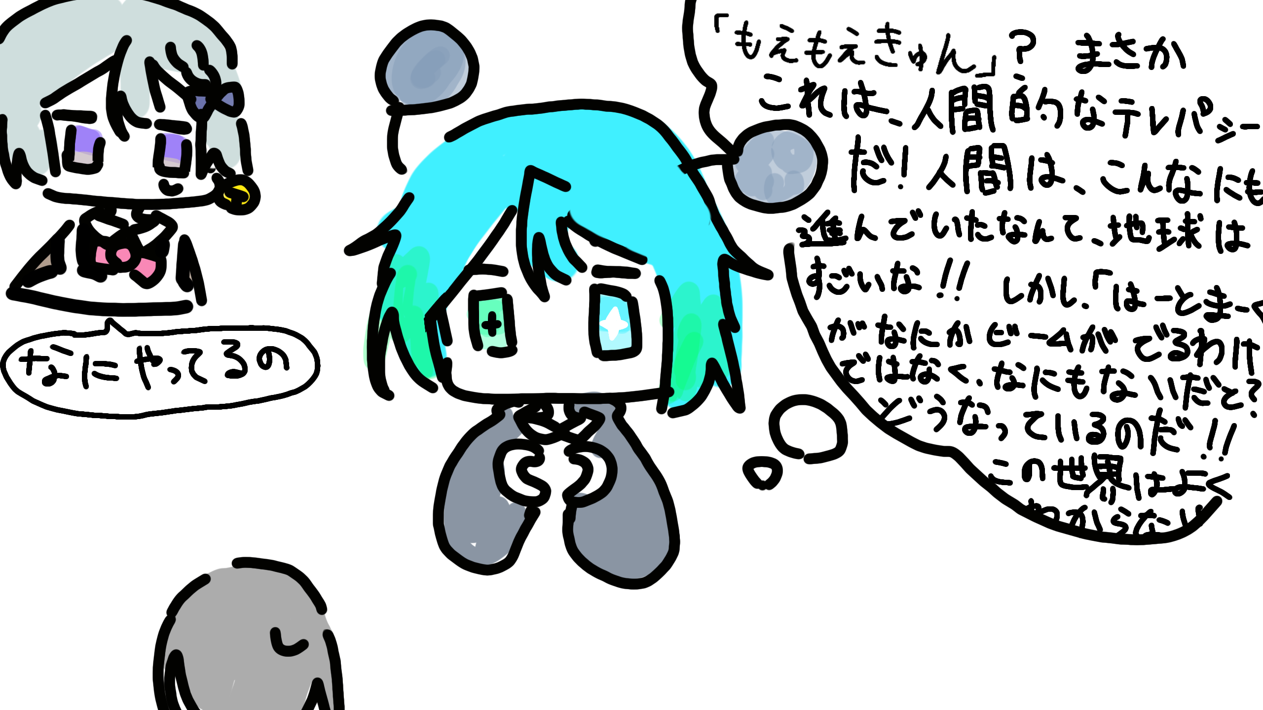 ええええ可愛すぎます!!!!!;;;;もえもえきゅんについて深い(?)考察をする未来クンチャン(?)も本当に人間じゃない感じがして可愛いし後ろで「なにやってんの」って言ってる薫もミニキャラですっごくすきです、、:sparkles:本当に描いてくれてありがとうございます!!!よかったら保存良いですか、!?