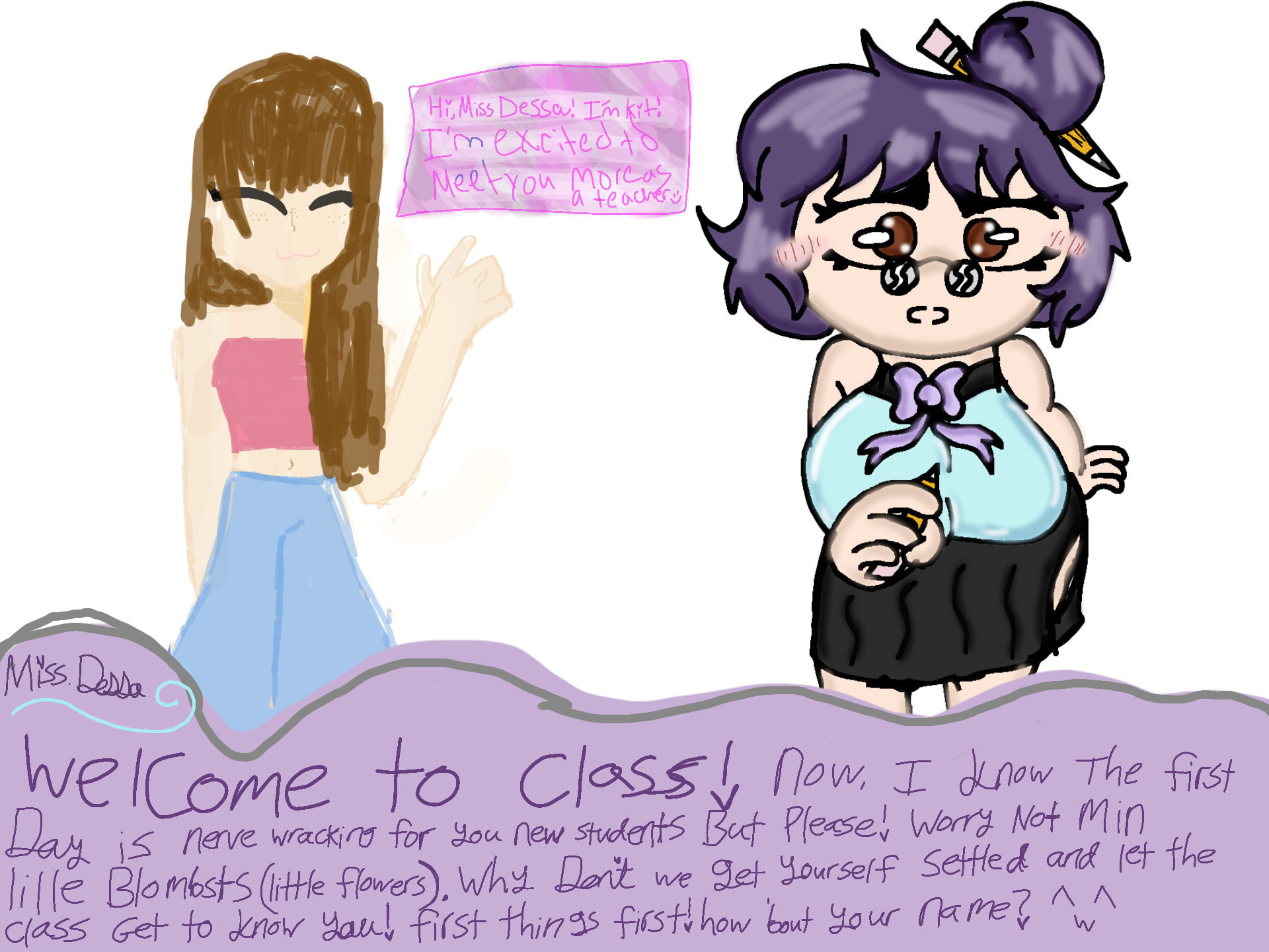 Welcome to #DessHS! ur teacher, Miss.Dessa, comforts you and asks for u to share ur name. what will u say/do?: