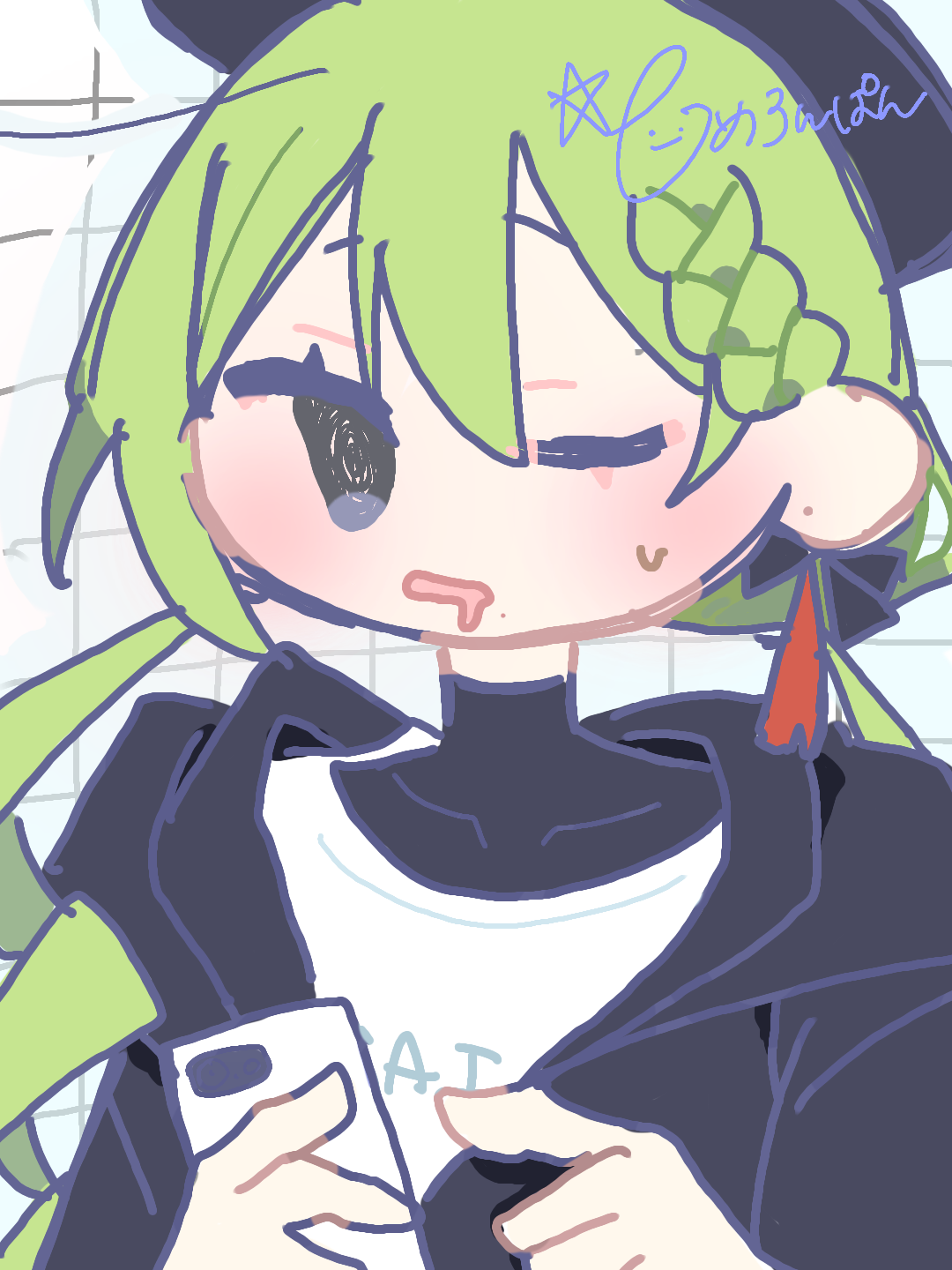 めちゃめちゃ表情が眠そうで可愛いです><というかサインの字も綺麗で可愛いですね~!背景まで描かれてて尊敬です!!
