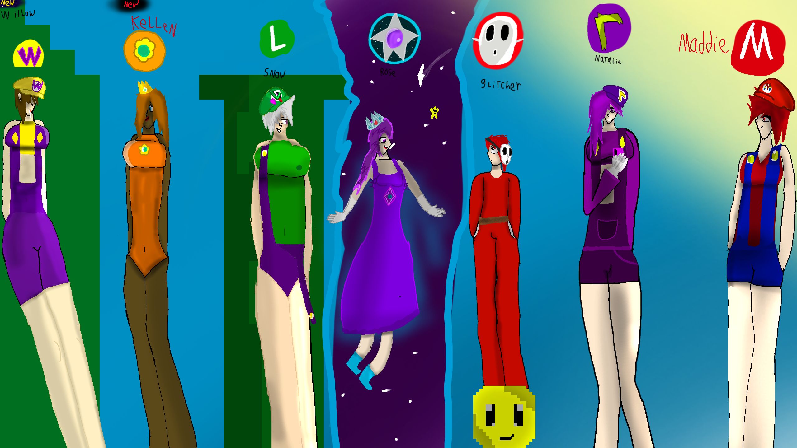 so we got in this photo rose [rosalina] natalie [waluigi] maddie/max [mario] willow [wario] kellen [daisy] glitcher [shy guy] and snow [luigi]
