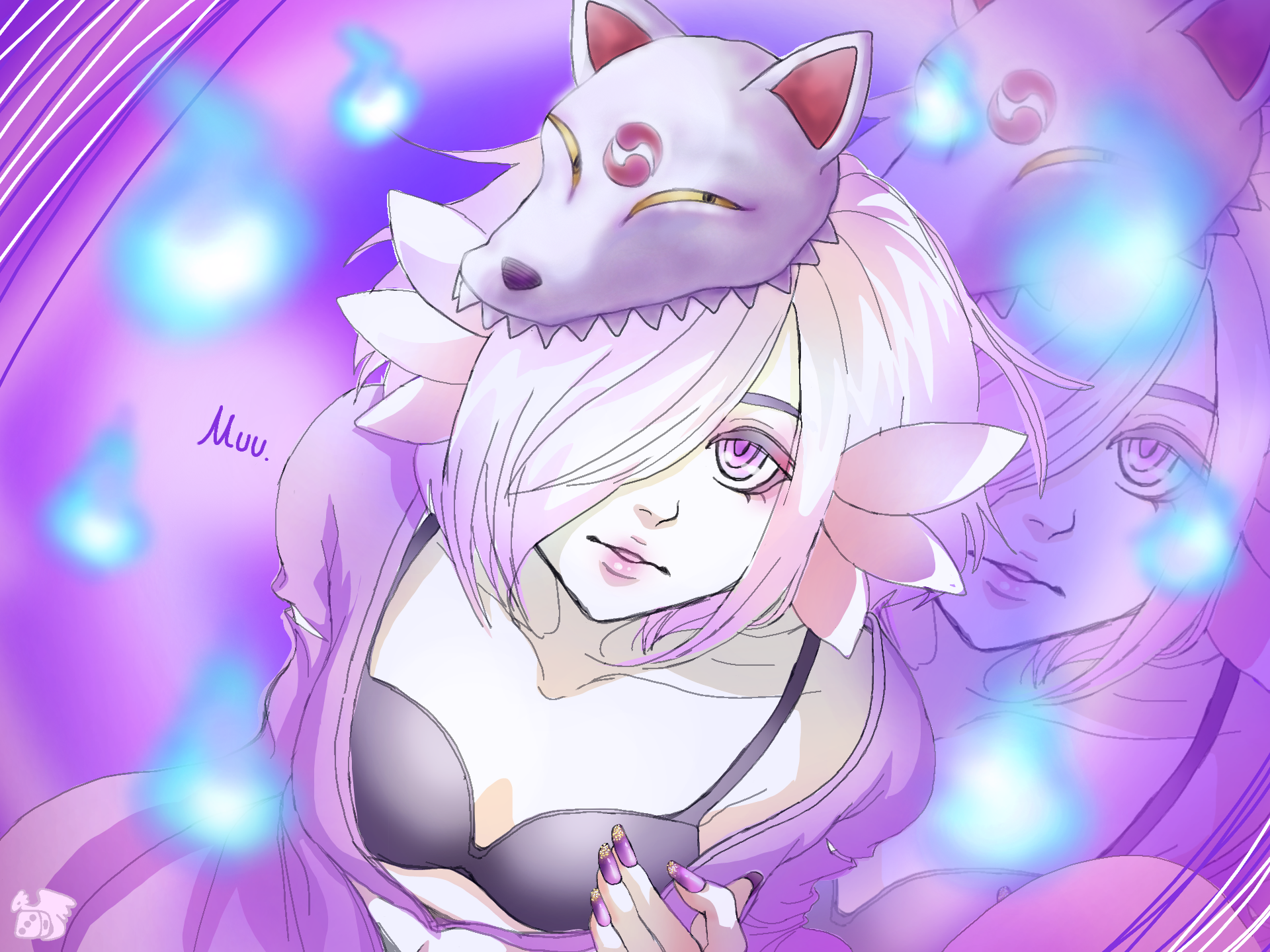 うぁお!!!妖艶で美しい!!肩紐がそれをより一層ひきたてている様に感じます♥少し大人な感じの夢浮ちゃんにドキドキです!!素敵な夢浮ちゃんを描いてくださり、ありがとうございます(〃><〃)正直「肩紐も、ええな~」と思ってしまいました^^ちょっと成長したら肩紐付きの服を着るとかいいな~、とか色々妄想しちゃいました★周りの青い火の玉も人間じゃない感を出していていいですね!!妖狐さんの何か企んでそうな感じも好きです^^本当にありがとうございました!!保存失礼します!!