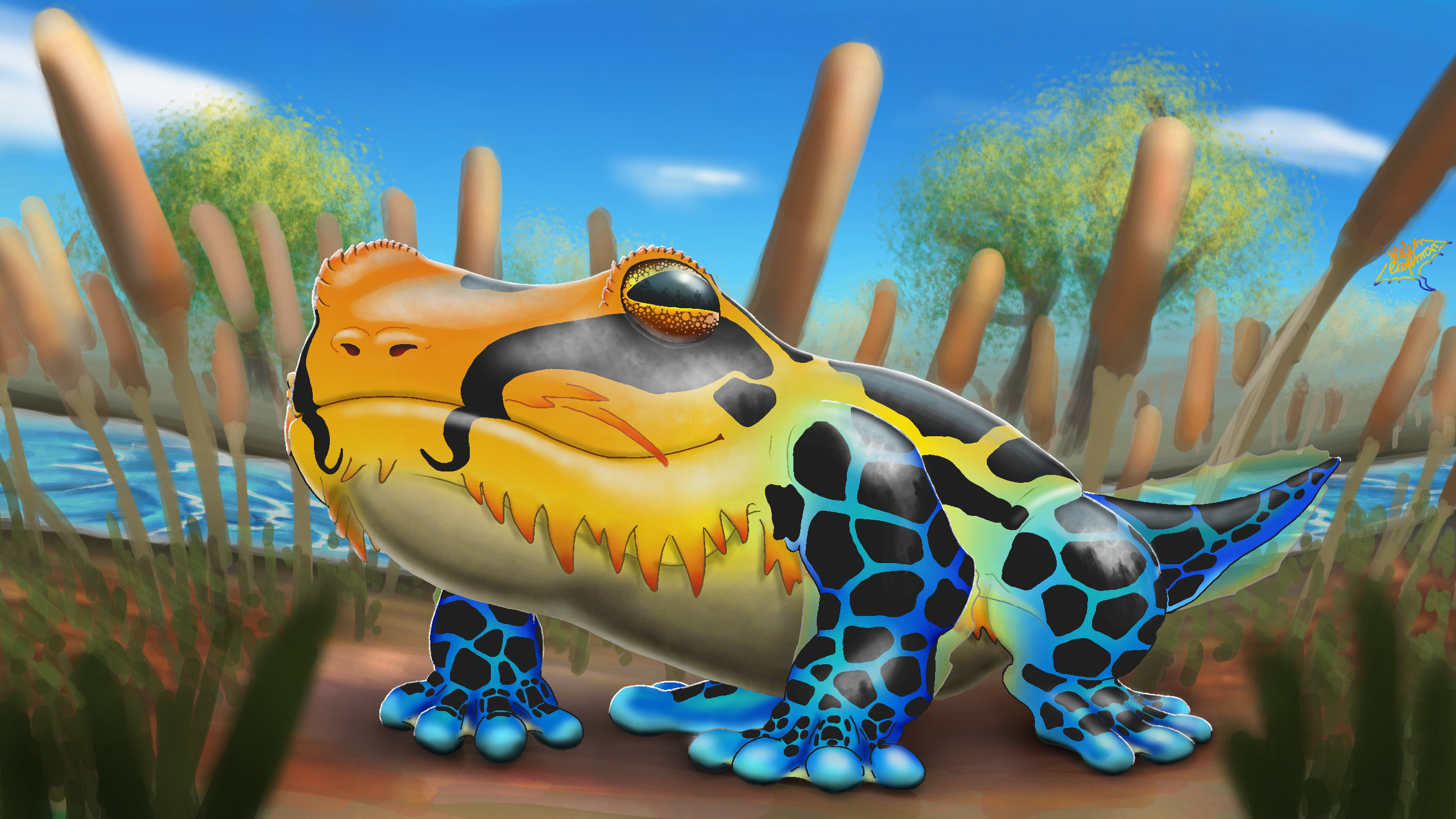 Started off as an idea watching a biology video with my Sweetheart, in which the topic of "aposematic coloration" was brought up, including pictures of poison dart frogs, and I had a moment of inspiration to paint a critter using poison frogs as reference.