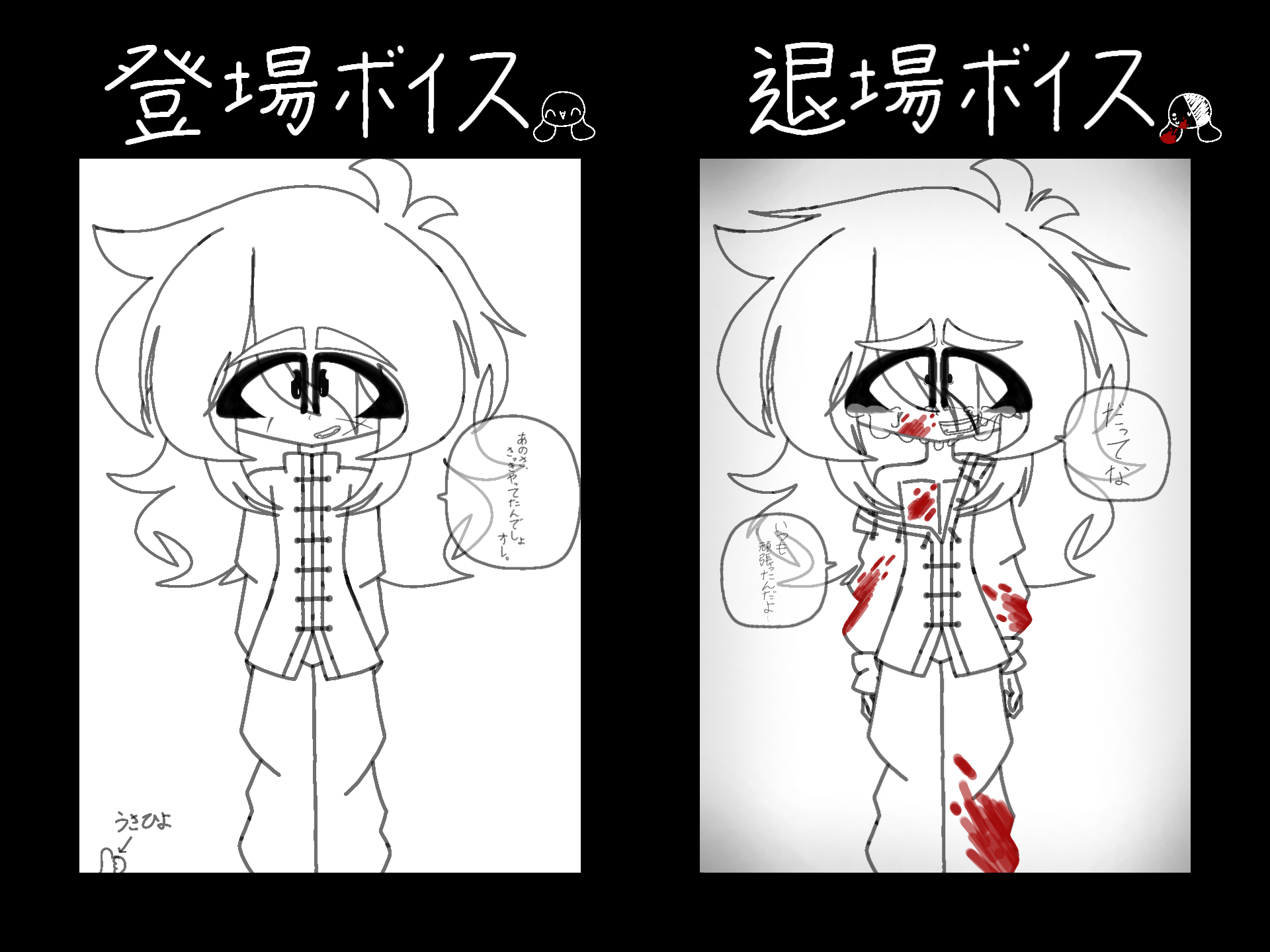 登場ボイスも退場ボイスもすごく解釈一致ですね!少し切ない感じなどがすごくわかりやすい表現で尊敬します!退場の時の血の表現が上手すぎませんか?わたしは血などの表現が苦手なのですごいです...。やっていただきありがとうございました!