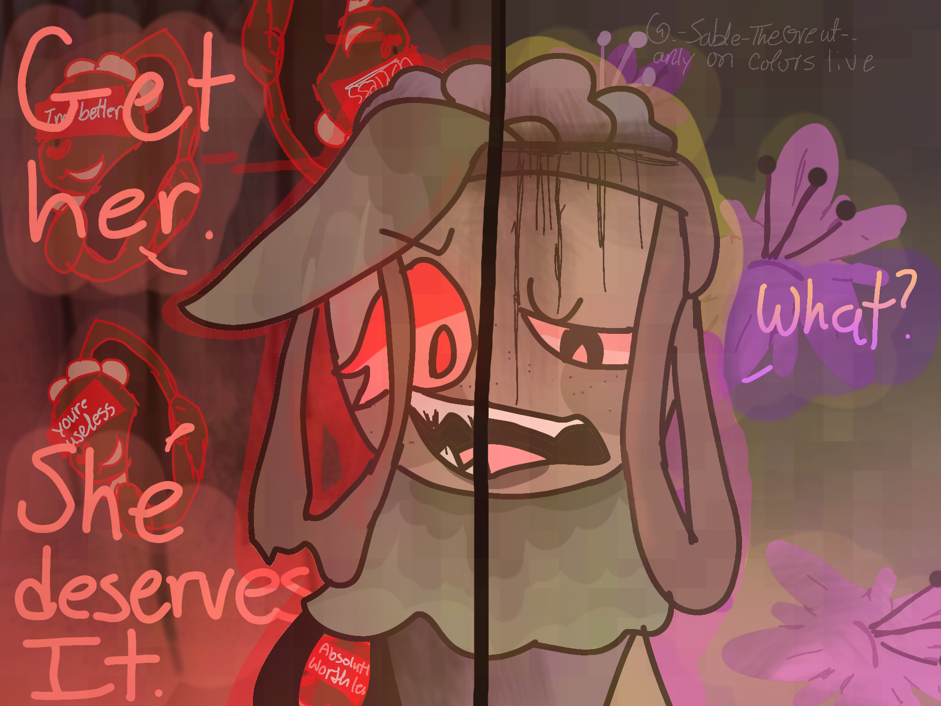 So she is talking in both emotion sides, the angry and scared side saying "get her" whileher sad side says "what?" like she doesnt want to hurt her.
