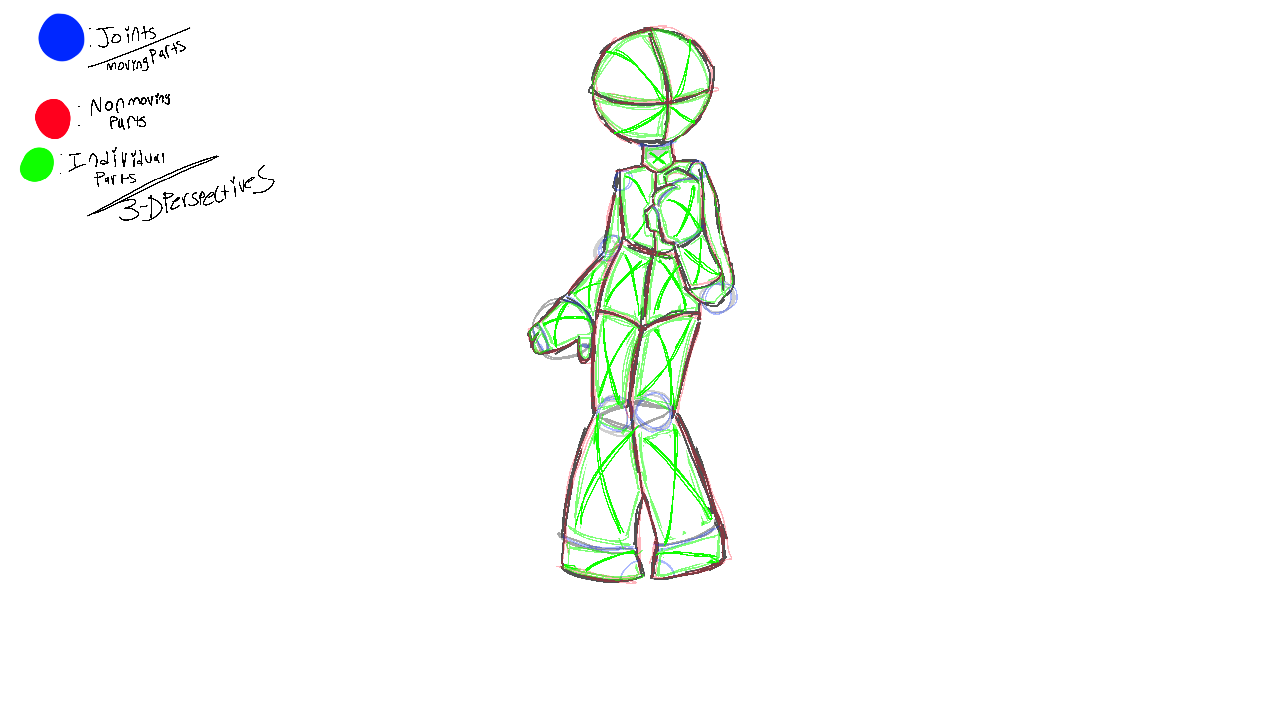 Blue: Joints, moving body parts.Red: Parts, non moving.Green: 3-D Perspective on parts.Feel free to use!