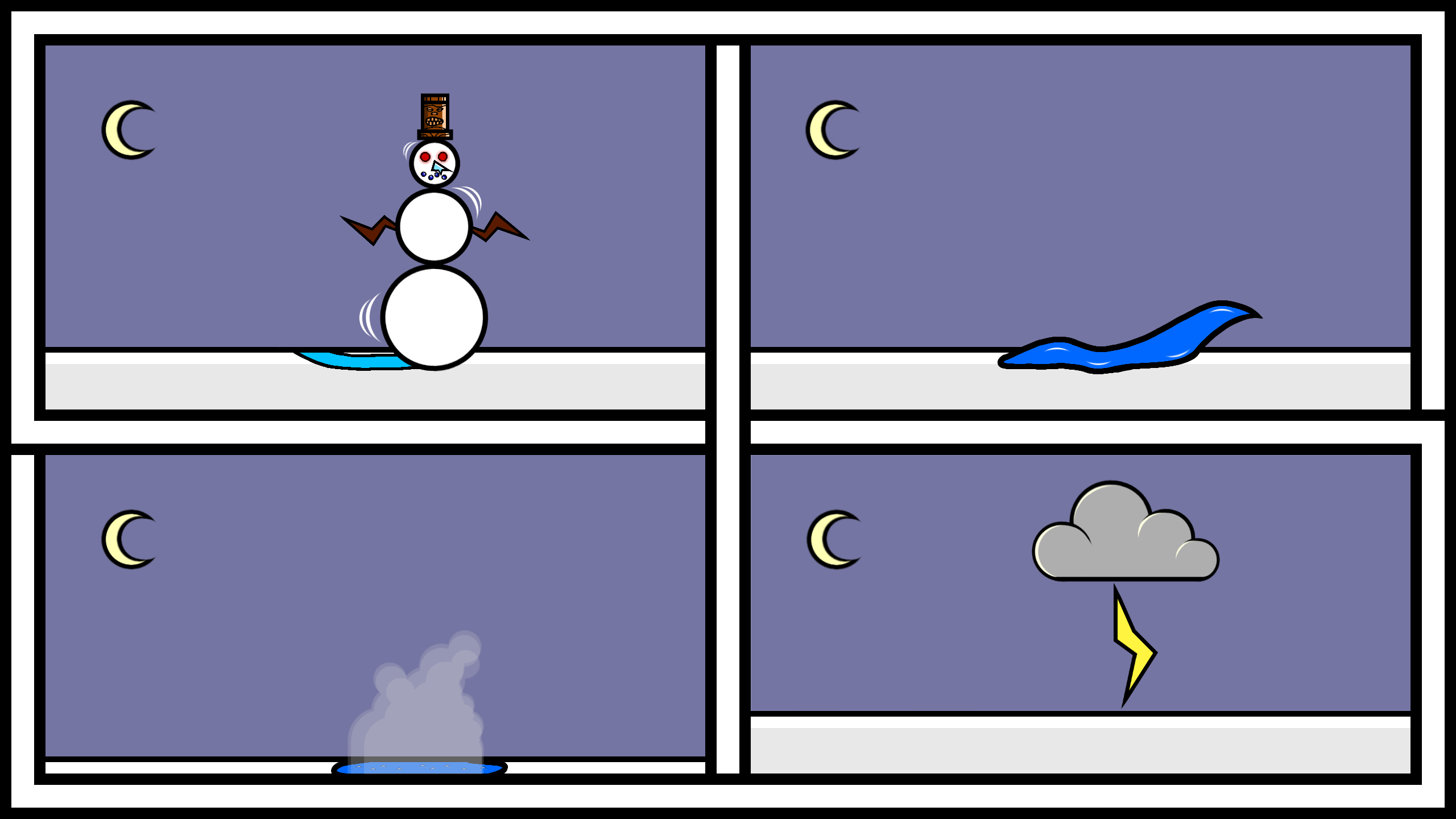Their name is a combination of the words habanero, solstice, ice and the saying, "have a nice day". Their initial form is a snowman that dons a tiki hat. They can melt into water and flow around viscously. They can further heat up and become a storm cloud where they can then build up static charge and strike the ground as lightning, where they rematerialize as their base form.