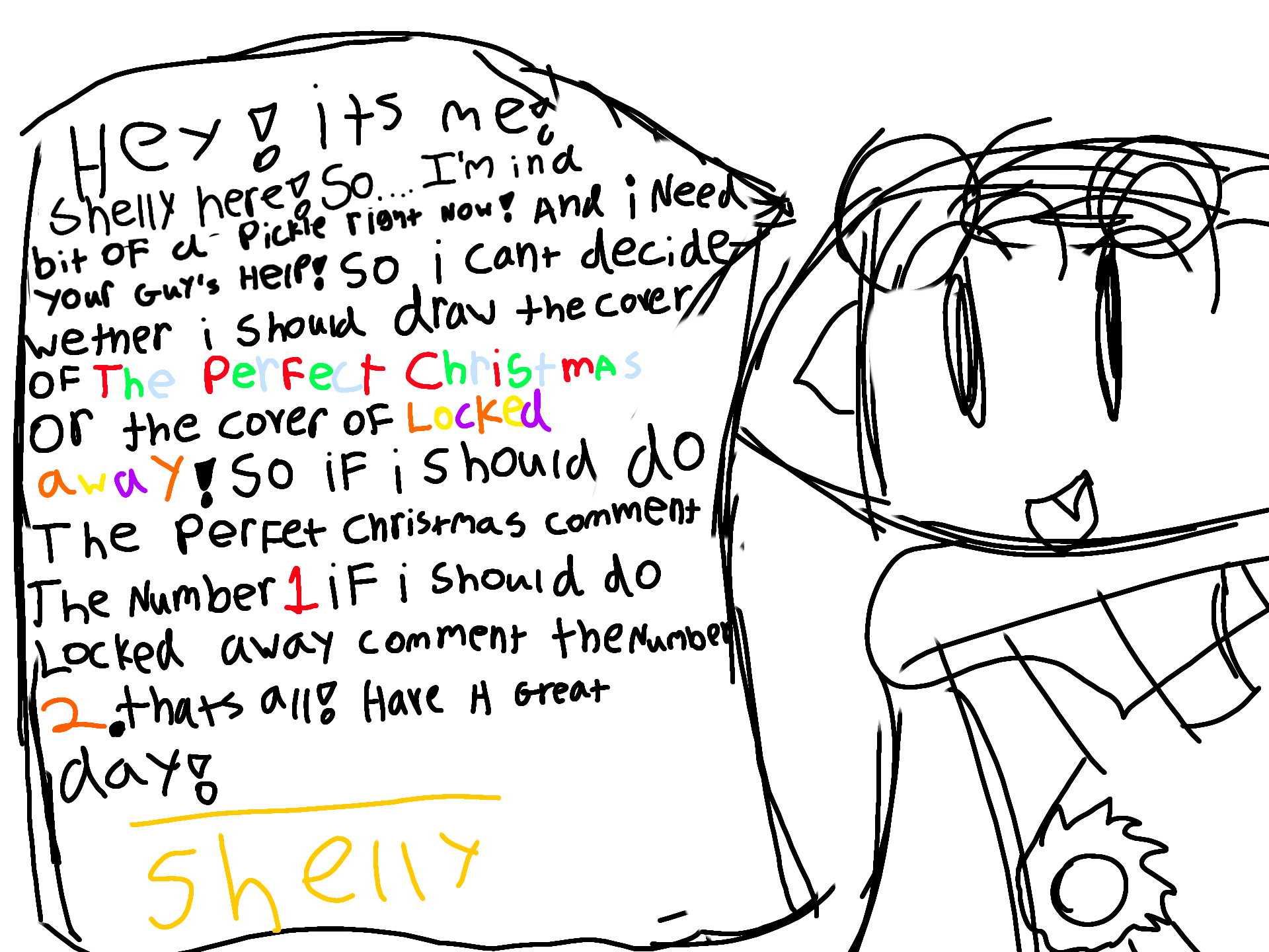 for short if you want me to draw the perfect Christmas cover comment 1! if you want me to draw the locked away cover comment 2! thats all! byee!! #sh3llysart