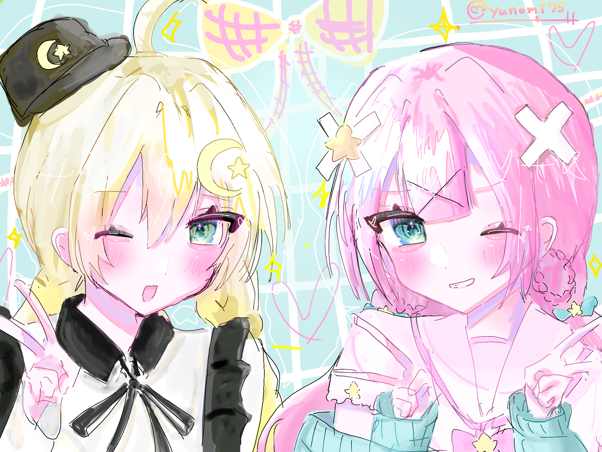 ゆのみさんリクエストありがとうございました♡ 二人ともキャラデザ天才ですね!!なんかキラキラしたのが似合いそうだったのですがカオスになってしまいましたごめんなさいもっとはやく描く予定が少し遅くなってしまい申し訳ないです;; @yunomi75 #ゆのみの代理