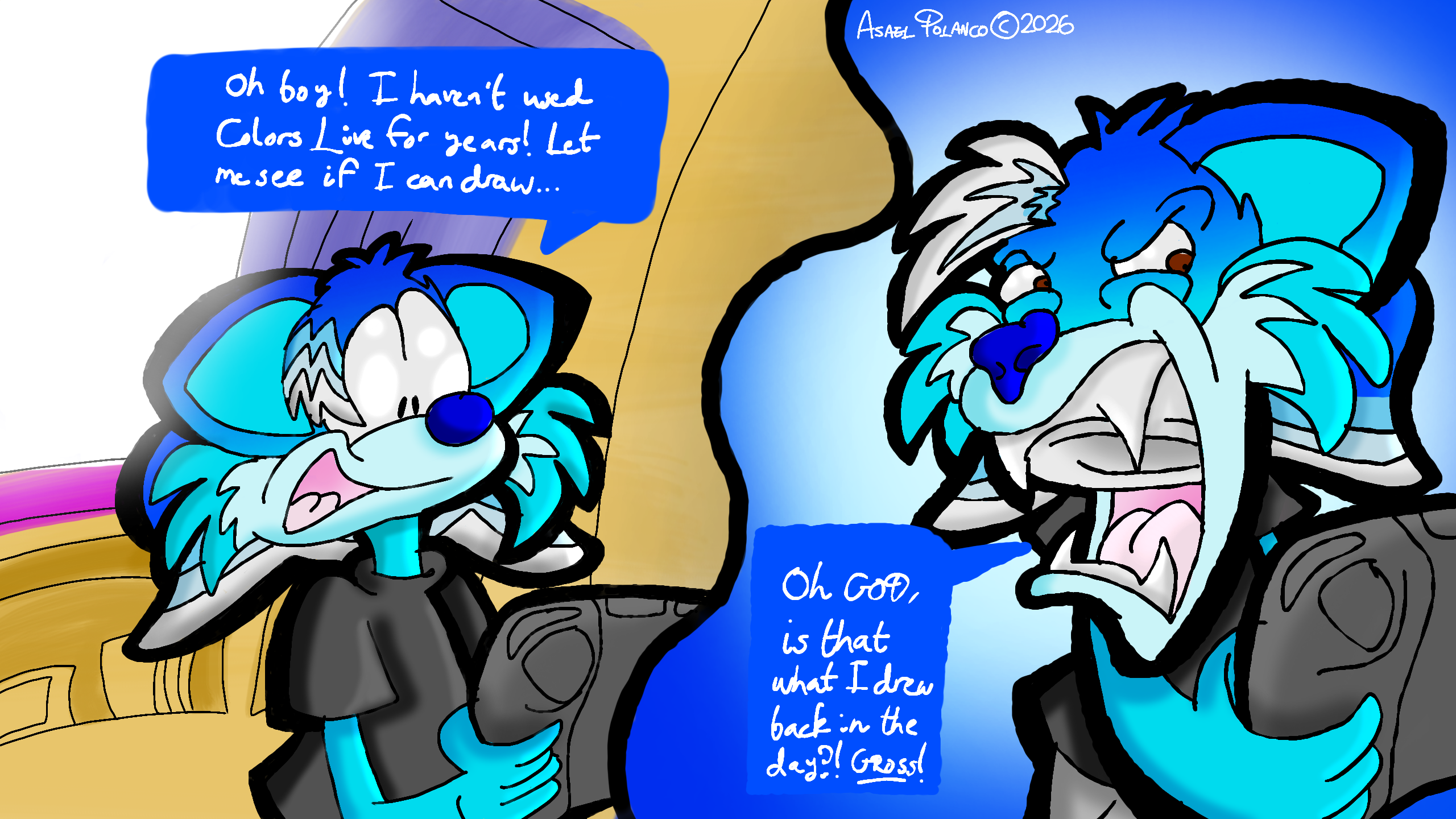 Hey everyone! It's been three years since I never used Colors, so I decided to come back! Unfortunately, my older art I did here is just plain cringeworthy to look at now and just fills me with absolute disdain, which is why I have to remove a good chunk of them. So here's me upon realizing I have Colors and looking at my older art...i'm still very unhappy about them.
