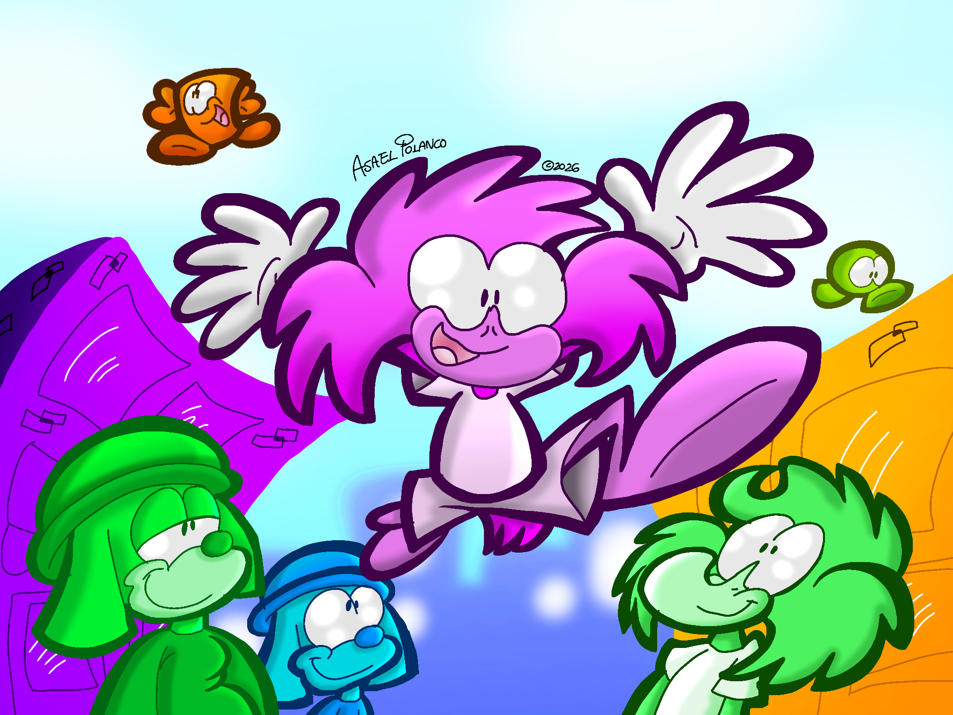 Surprise! Meet Duckly, Sackhead, Shorty, Splatty, Jimbo and Jumbo! They're characters of an upcoming animated series of shorts I am doing! They can be a bit crazy, but hey! These characters are ones that I am most proud of and I can't wait for you to see their shenanigans through Colors!