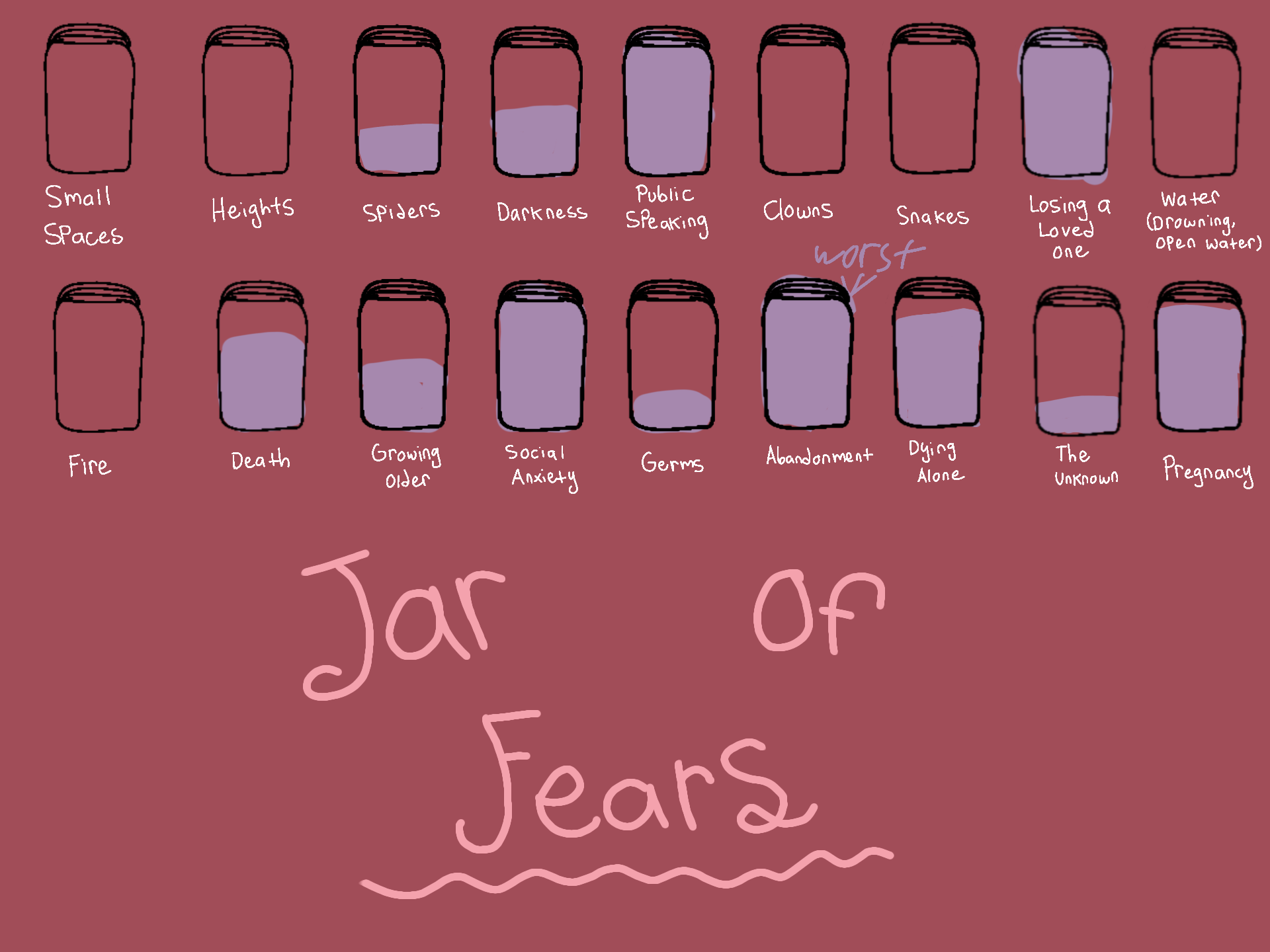 Being left behind by everyone amd them all having bad memories of me or causing someone to commit suicide by messing up too badly OH, and public speaking.