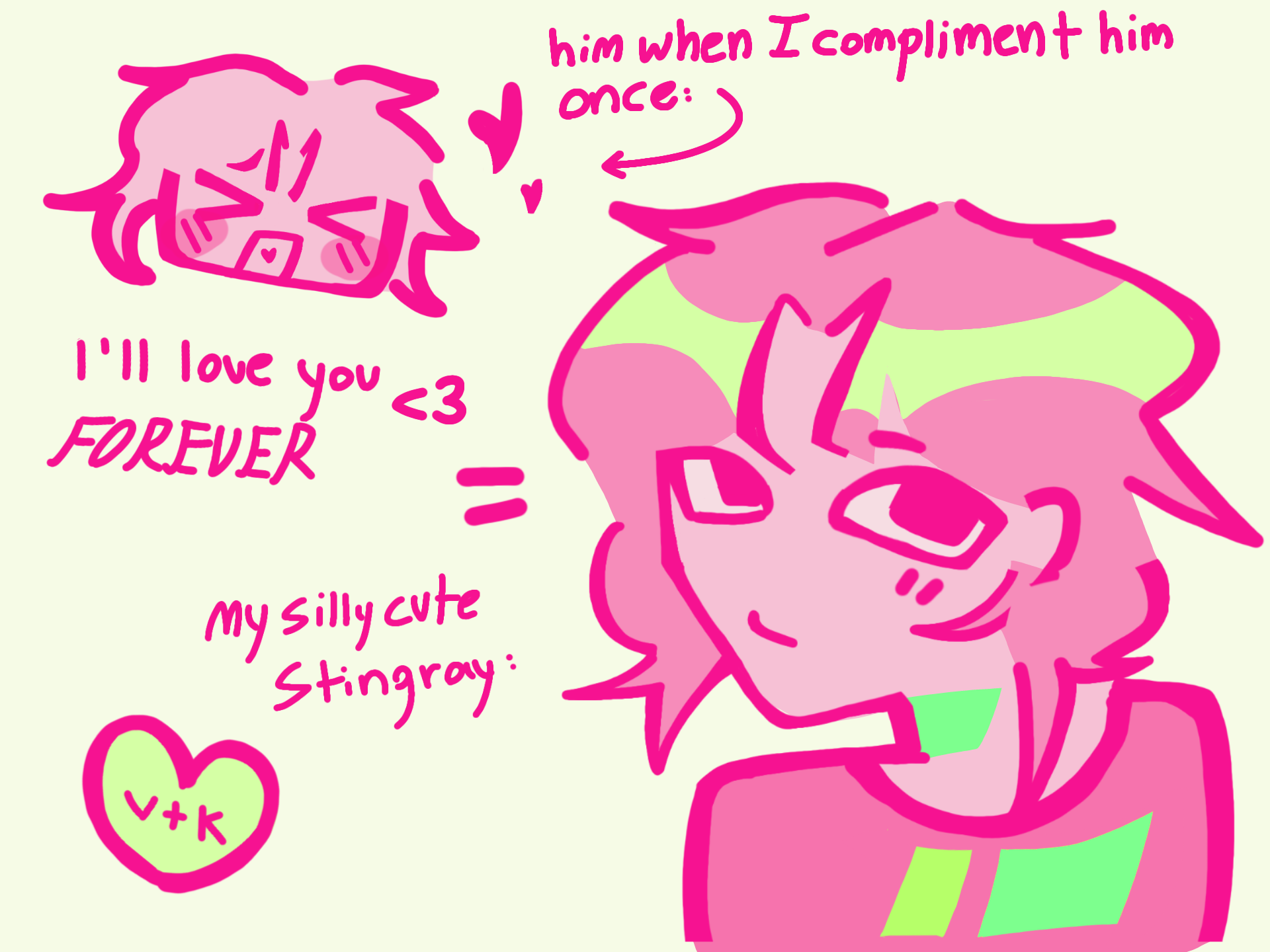dude he's so cute like on call I'll compliment him and he'll squeal and get red, then cover his face HE IS SO DAMN SHY RAAAAAA I LOVE MY CUTIE. also no Vince isn't pink I just wanted to color with pink and green :3 I can't wait to marry this dude bro is legit my other half